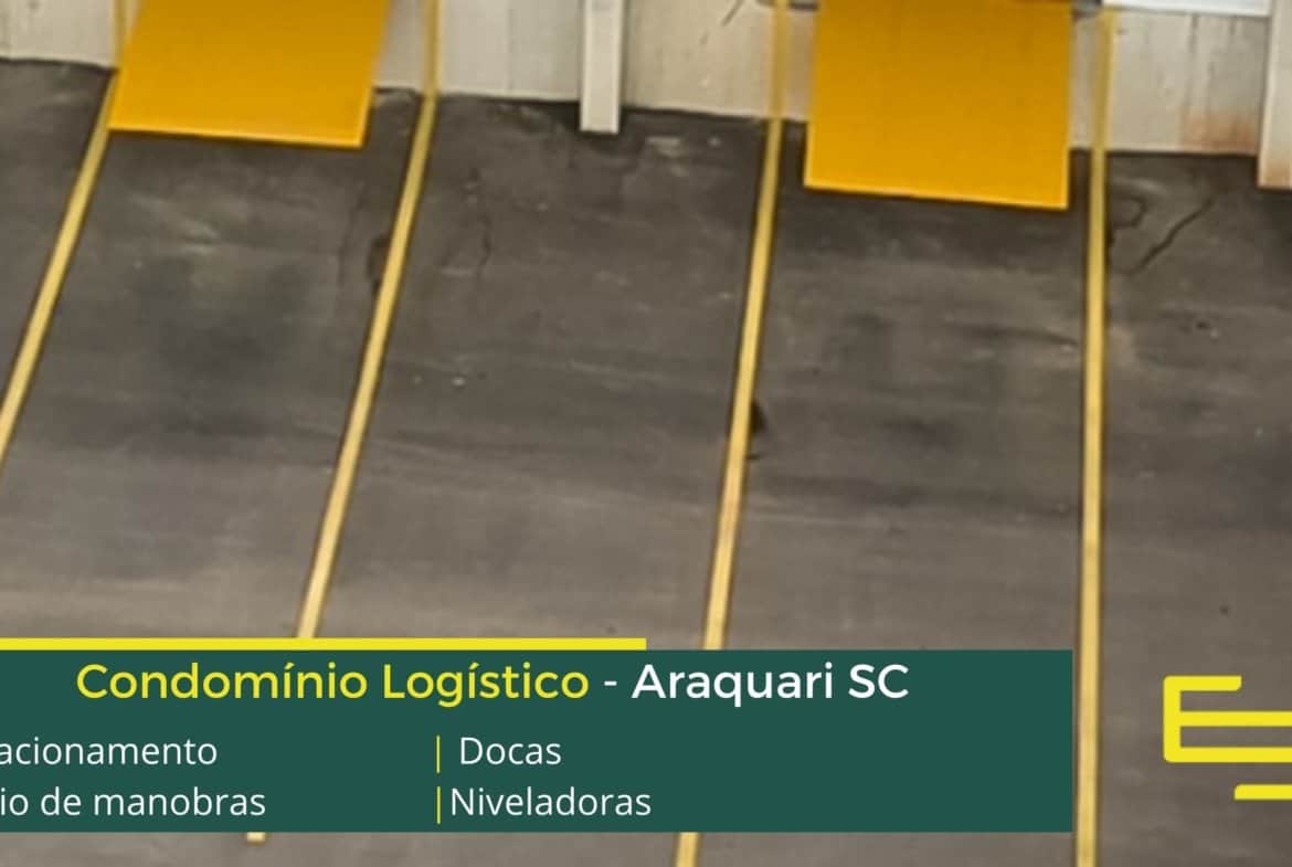 - Galpão logístico para alugar em Araquari SC com piso industrial e além disso, polido que permitem uso de empilhadeiras.