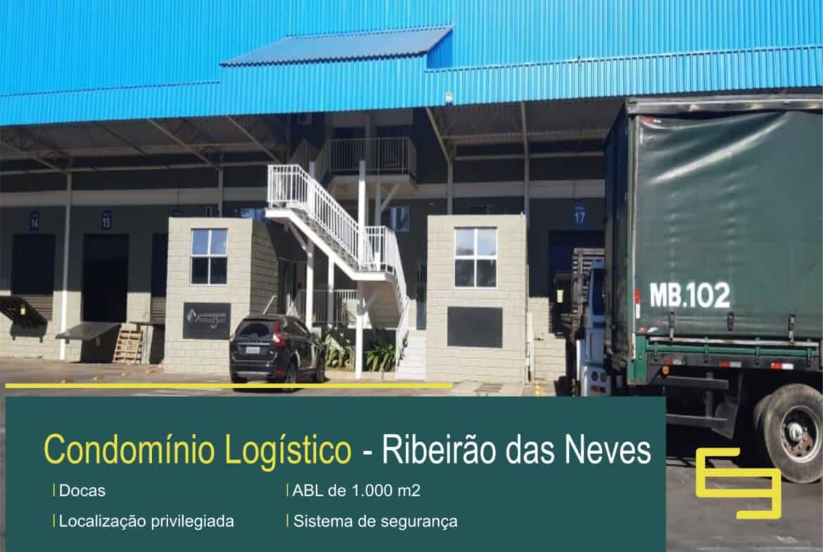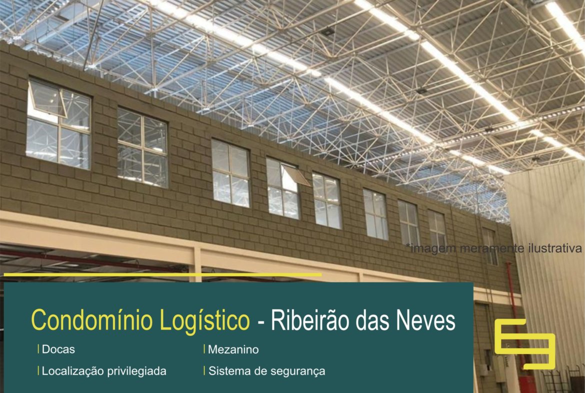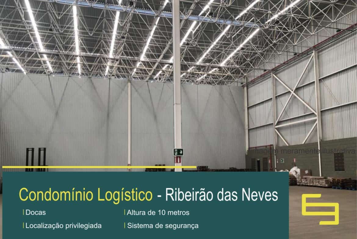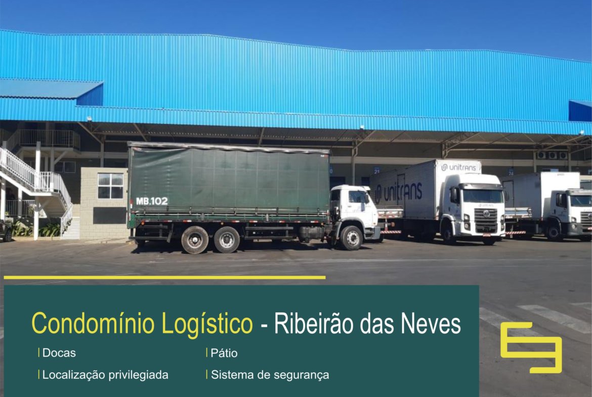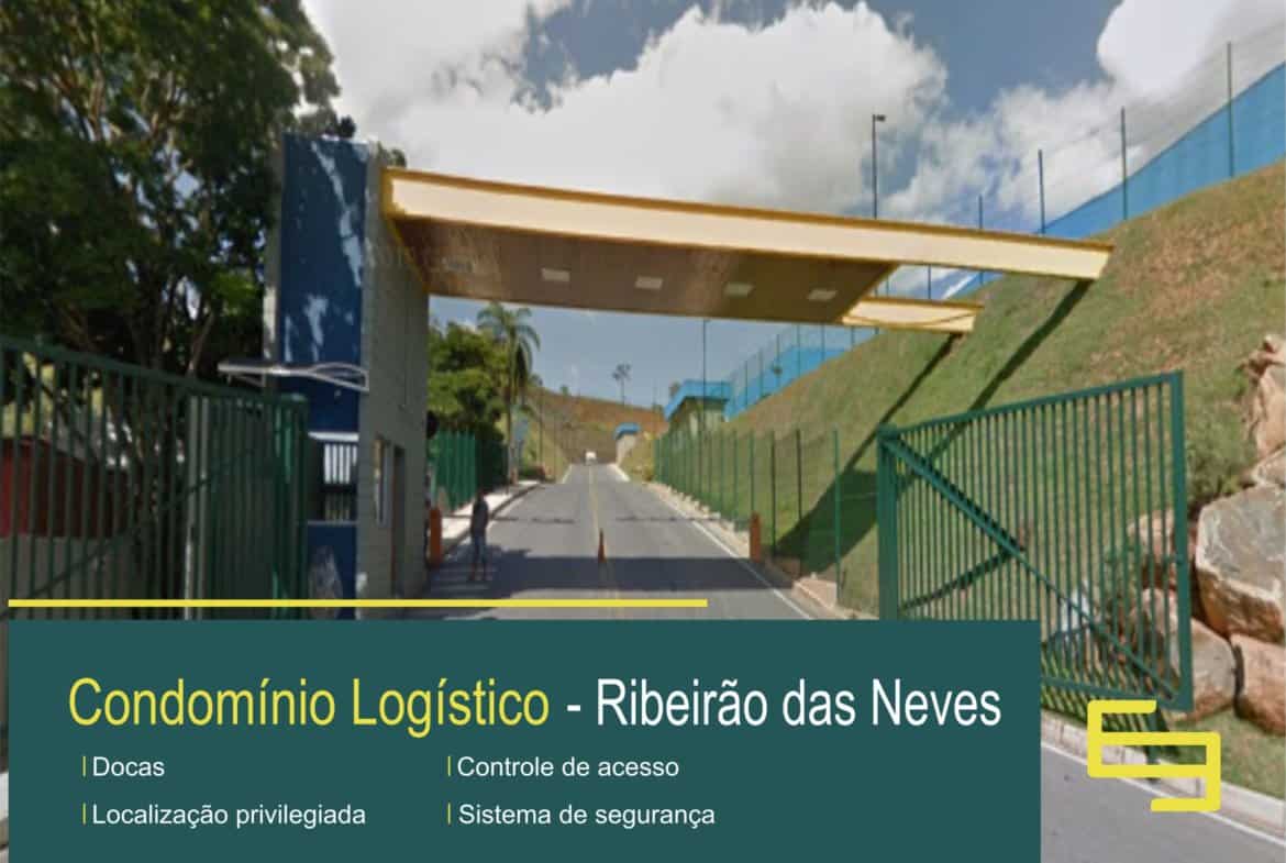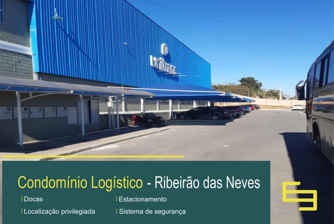 Galpão para alugar em Ribeirão das Neves em condomínio logístico que conta com controle de acesso e porteiro 24 horas, e além disso, galpões modulares com no mínimo 4 docas por módulo com completa estrutura=tura para empresas de transporte e distribuição.
