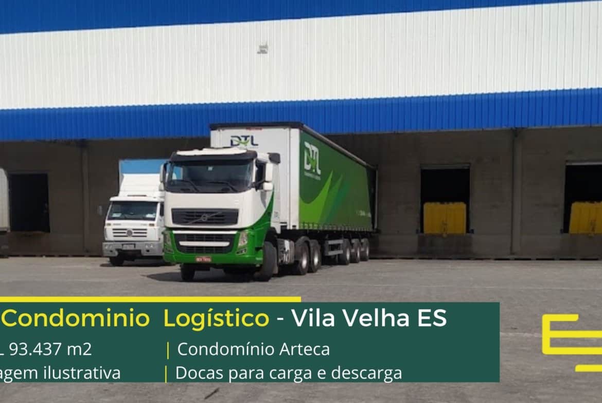 Aluguel de galpão logístico em Vila Velha ES, em condomínio com segurança com guarita blindada, eclusas, galpões modulares com docas para carga e descarga, e além disso, amplo pátio de manobras totalmente pavimentado.