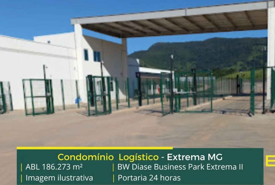 Galpão para alugar na cidade de Extrema em condomínio logístico de alto padrão, com 240 vagas de carretas e acesso direto pela BR 381, com estrutura completa de segurança na portaria e em seu perímetro.