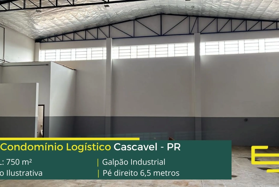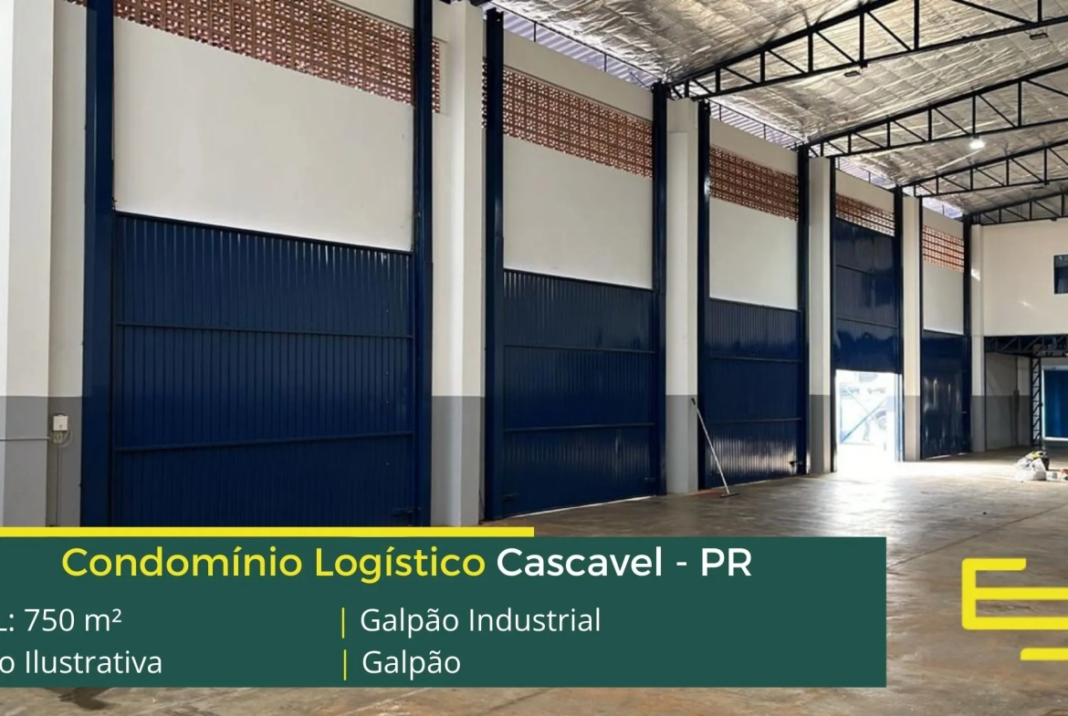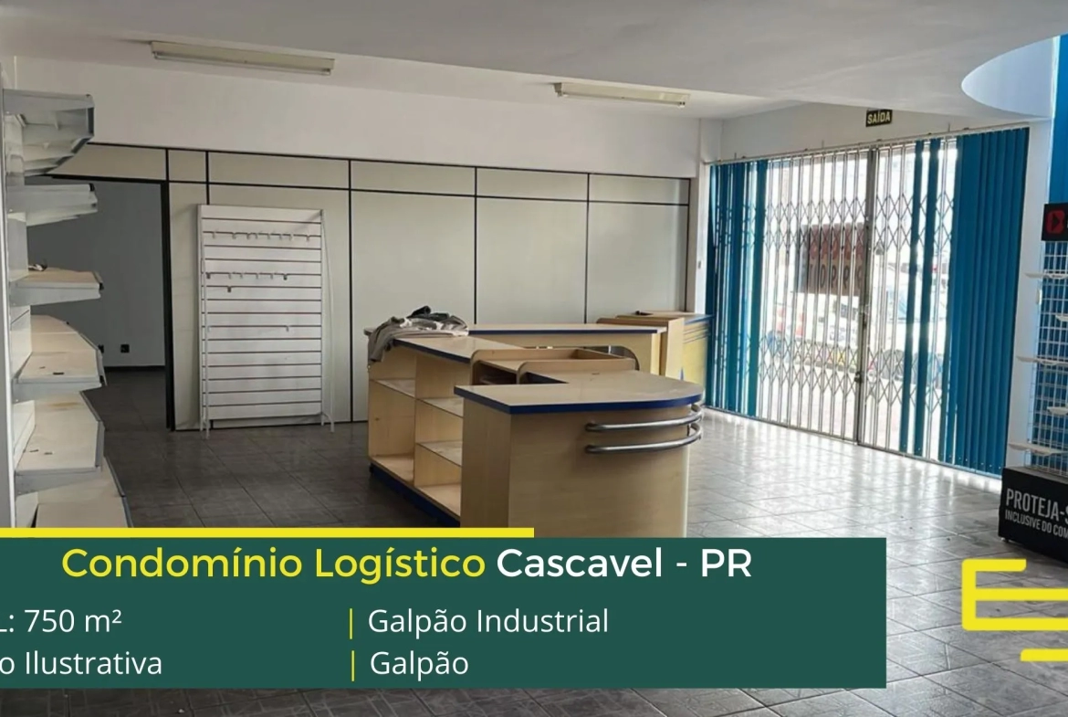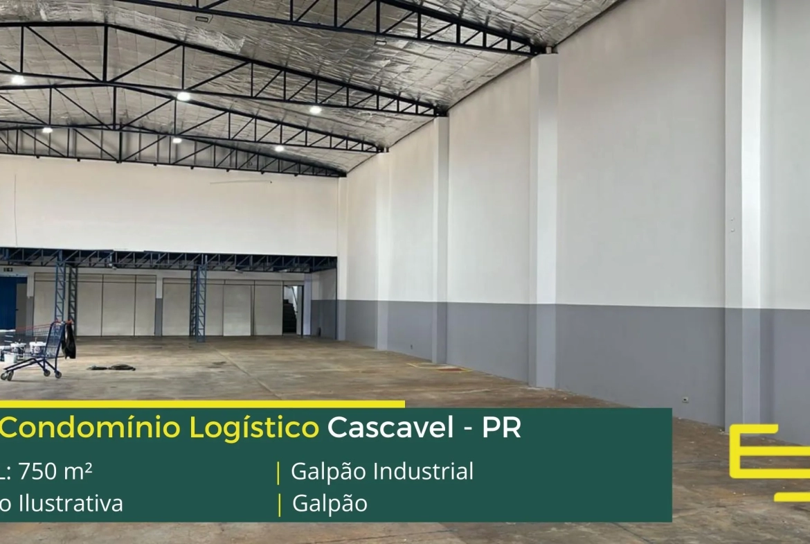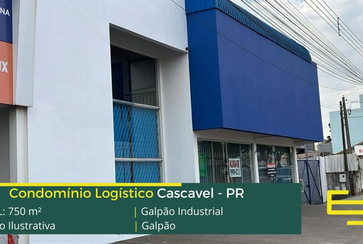 Aluguel de galpões em Cascavel – que é ideal para logística, transportes e além disso, distribuição, possui diferencial em sua localização, a 850 metros da BR-277, este galpão para locação possuí área locável total de 750 m².