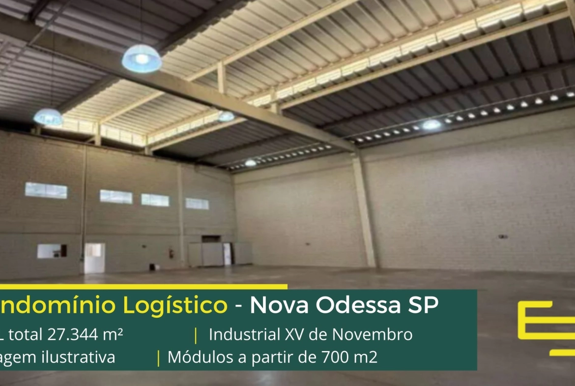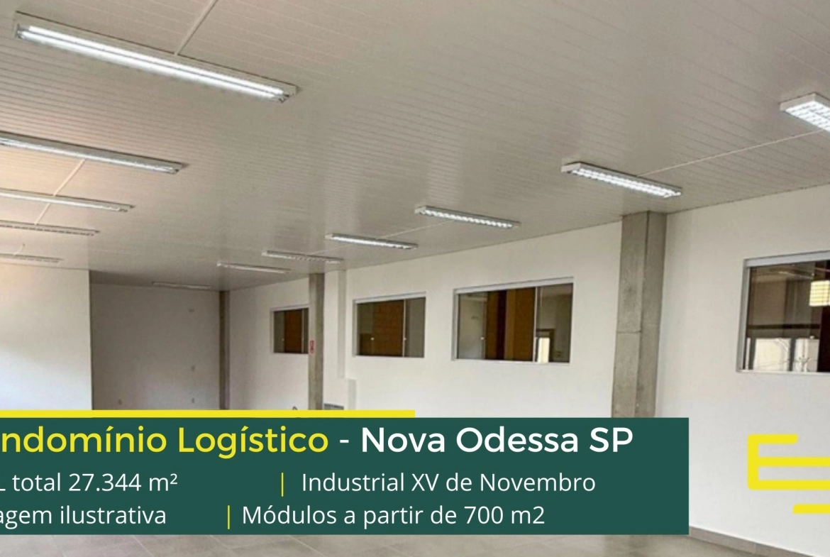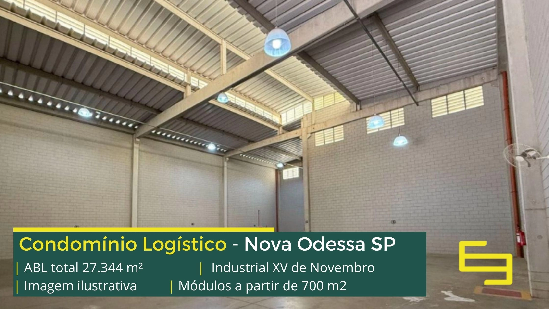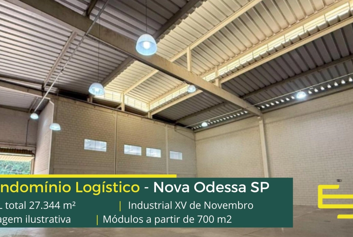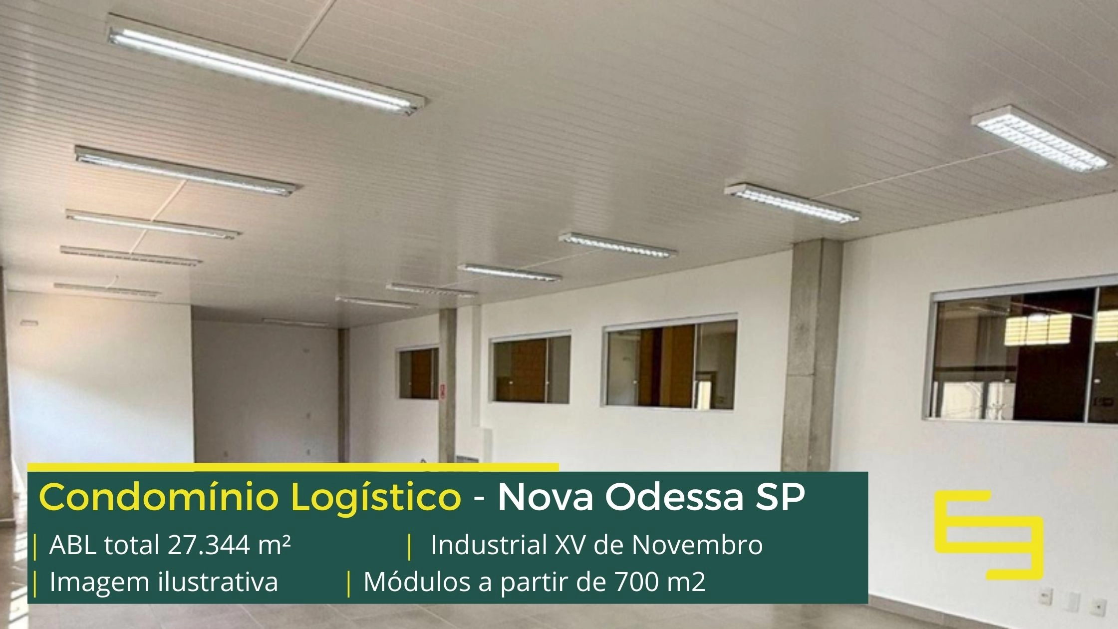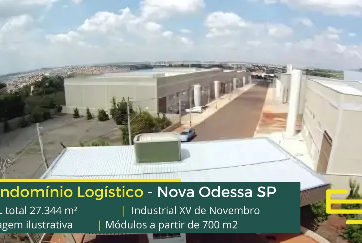 Aluguel de galpões em Nova Odessa em condomínio logístico localizado a 5,3 km da SP 304, e a 6,5 da Rodovia 330, e além disso com fácil acesso as cidades de Americana e Hortolândia, O condomínio industrial XV de novembro, conta com área total construída de 27.344 m² e que permite aluguel modular e flexível de galpão em Nova Odessa SP a partir de 700 m².