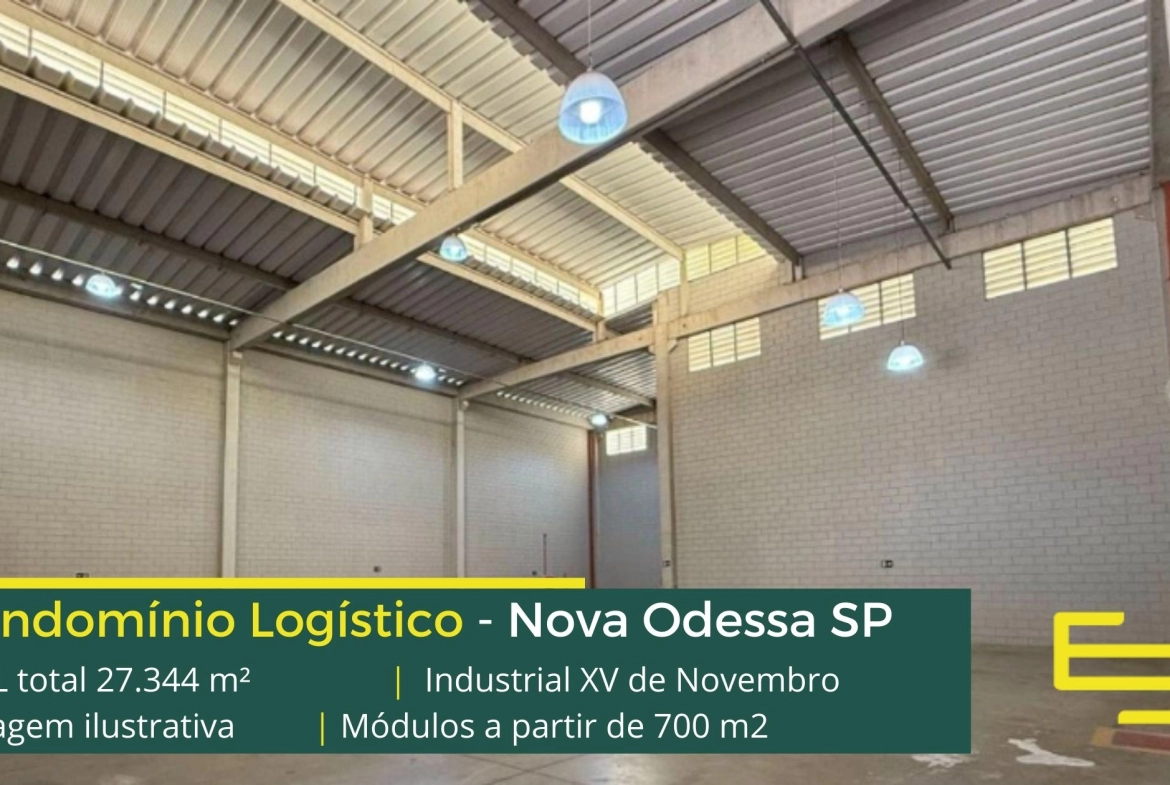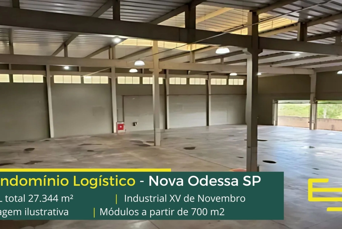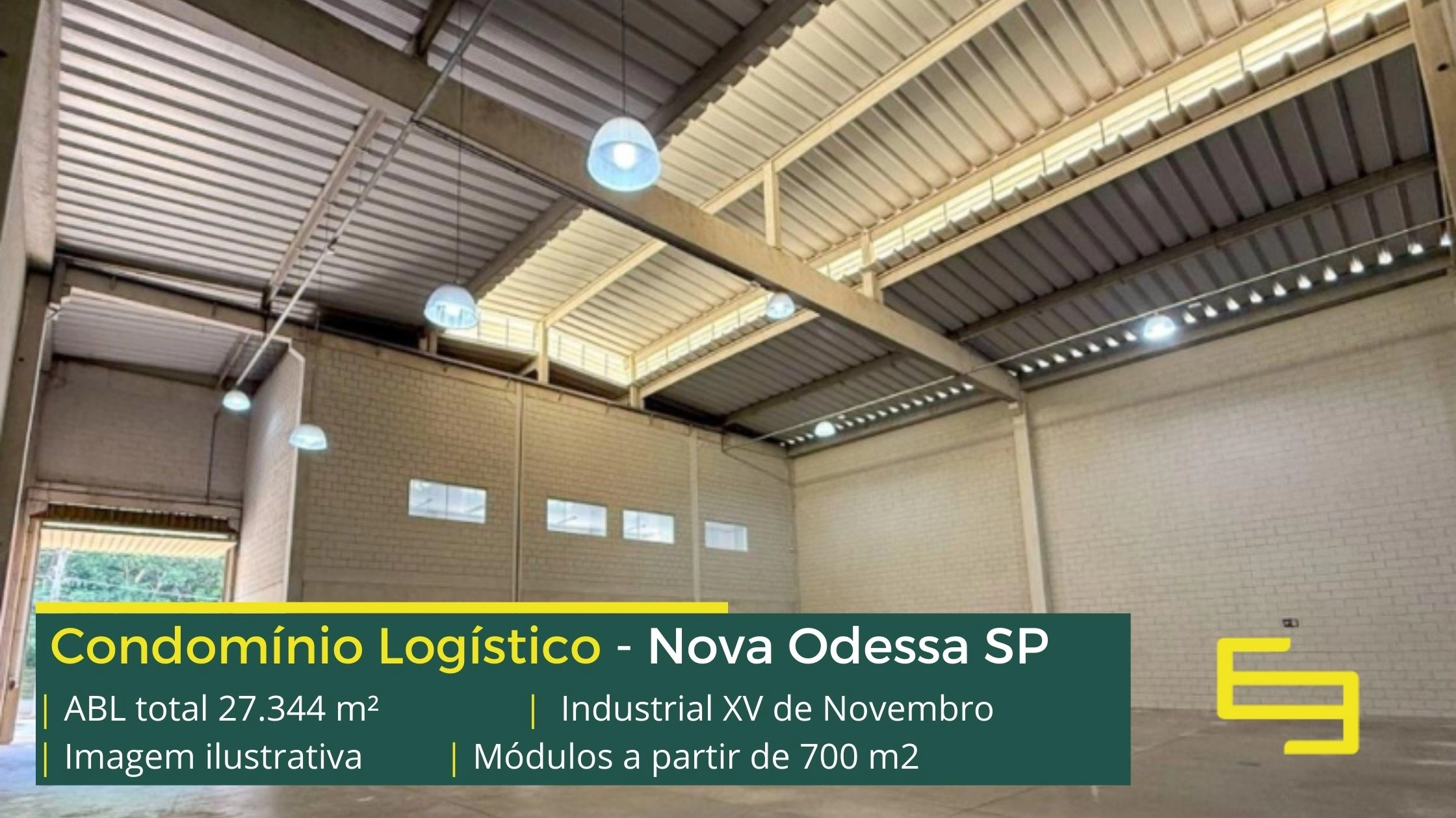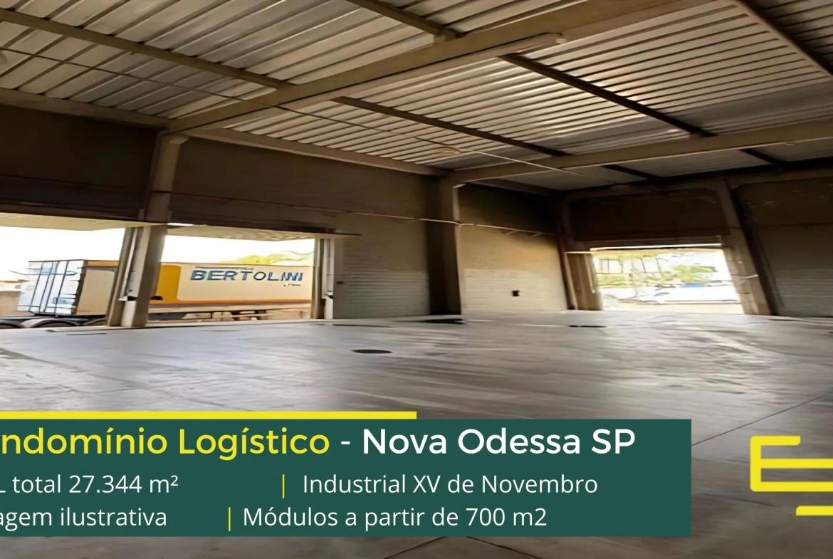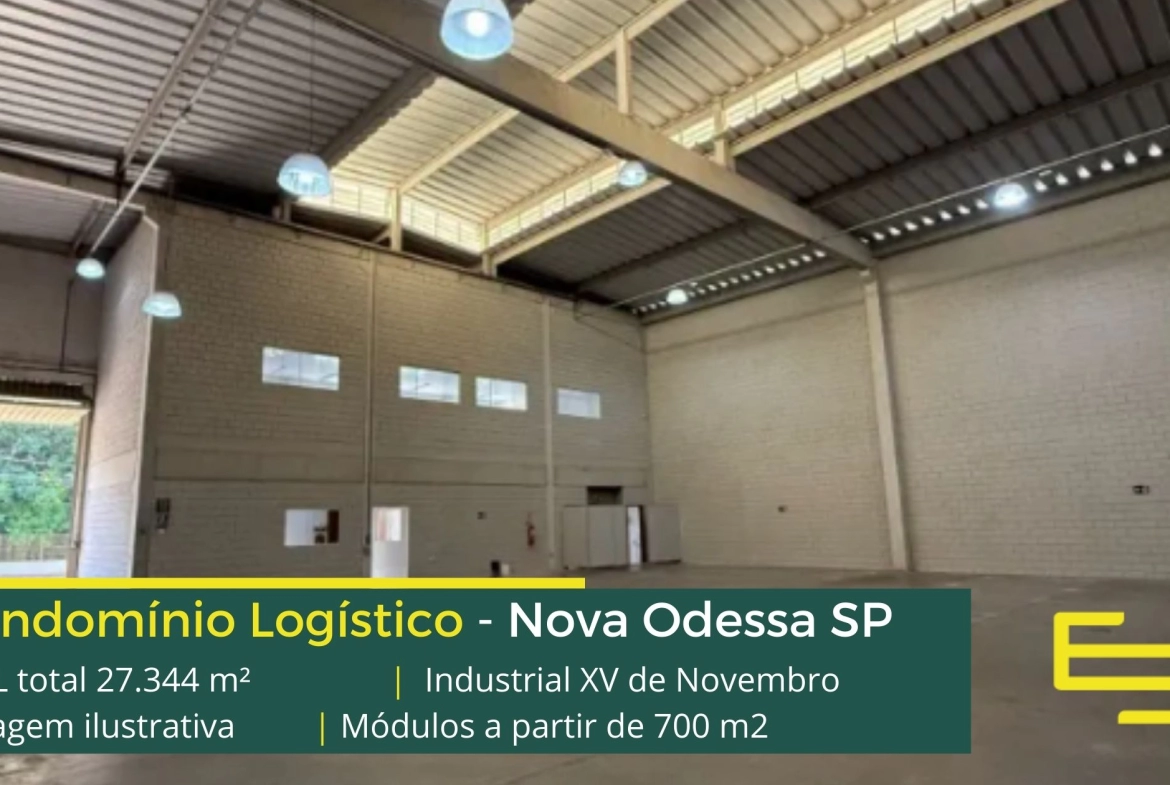 Aluguel de galpões em Nova Odessa em condomínio logístico localizado a 5,3 km da SP 304, e a 6,5 da Rodovia 330, e além disso com fácil acesso as cidades de Americana e Hortolândia, O condomínio industrial XV de novembro, conta com área total construída de 27.344 m² e que permite aluguel modular e flexível de galpão em Nova Odessa SP a partir de 700 m².