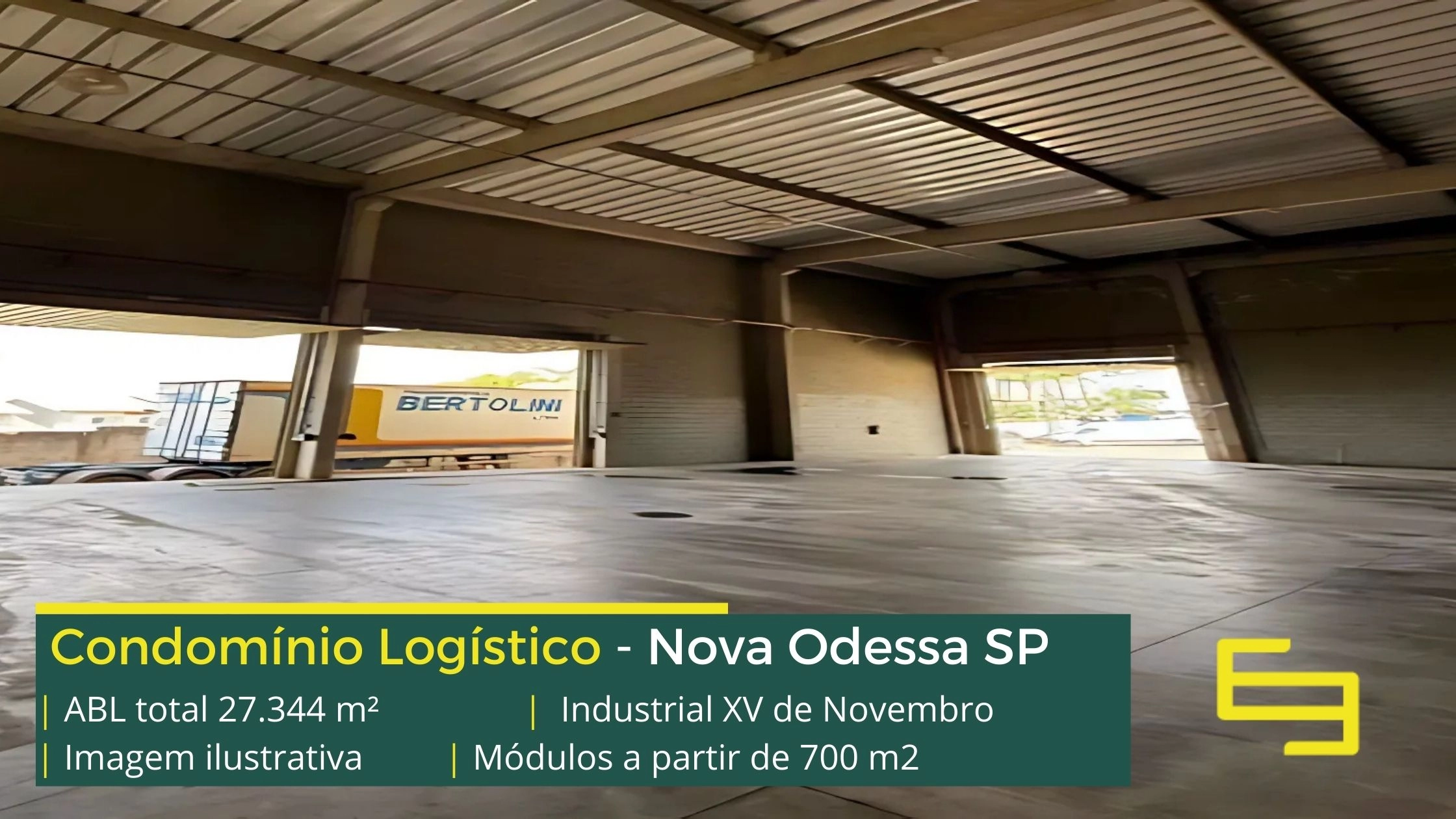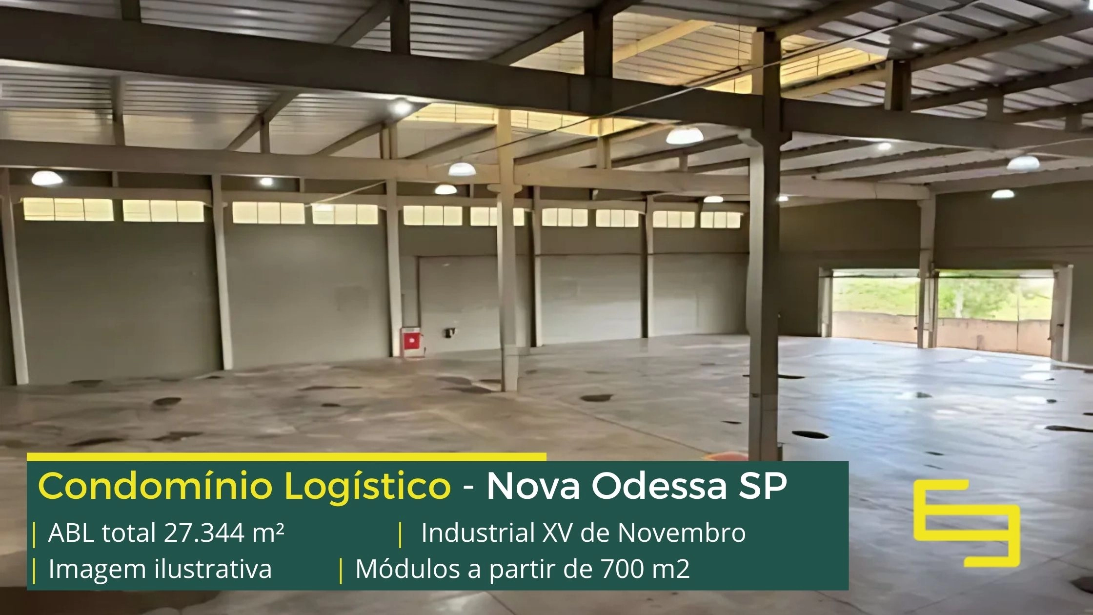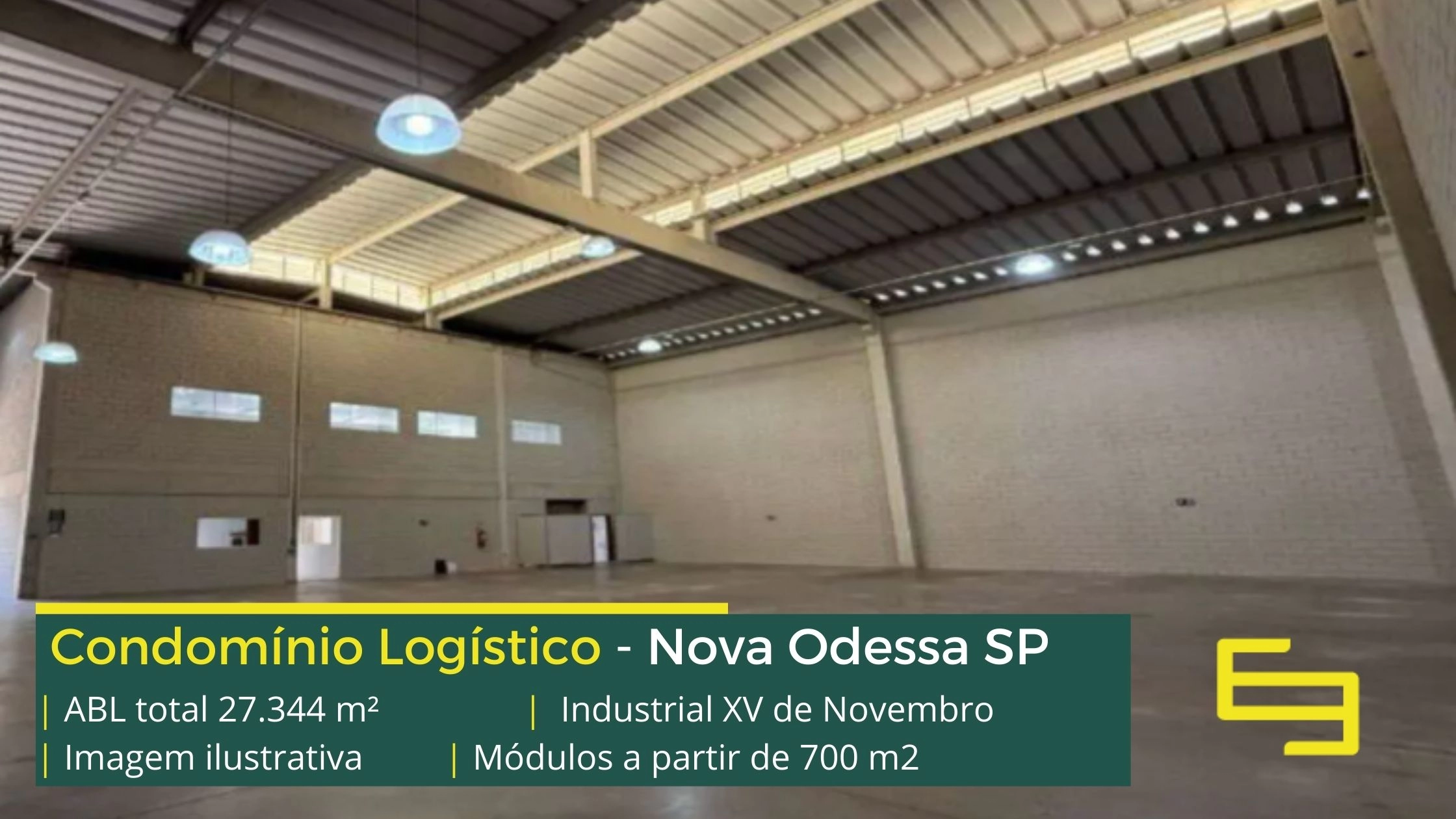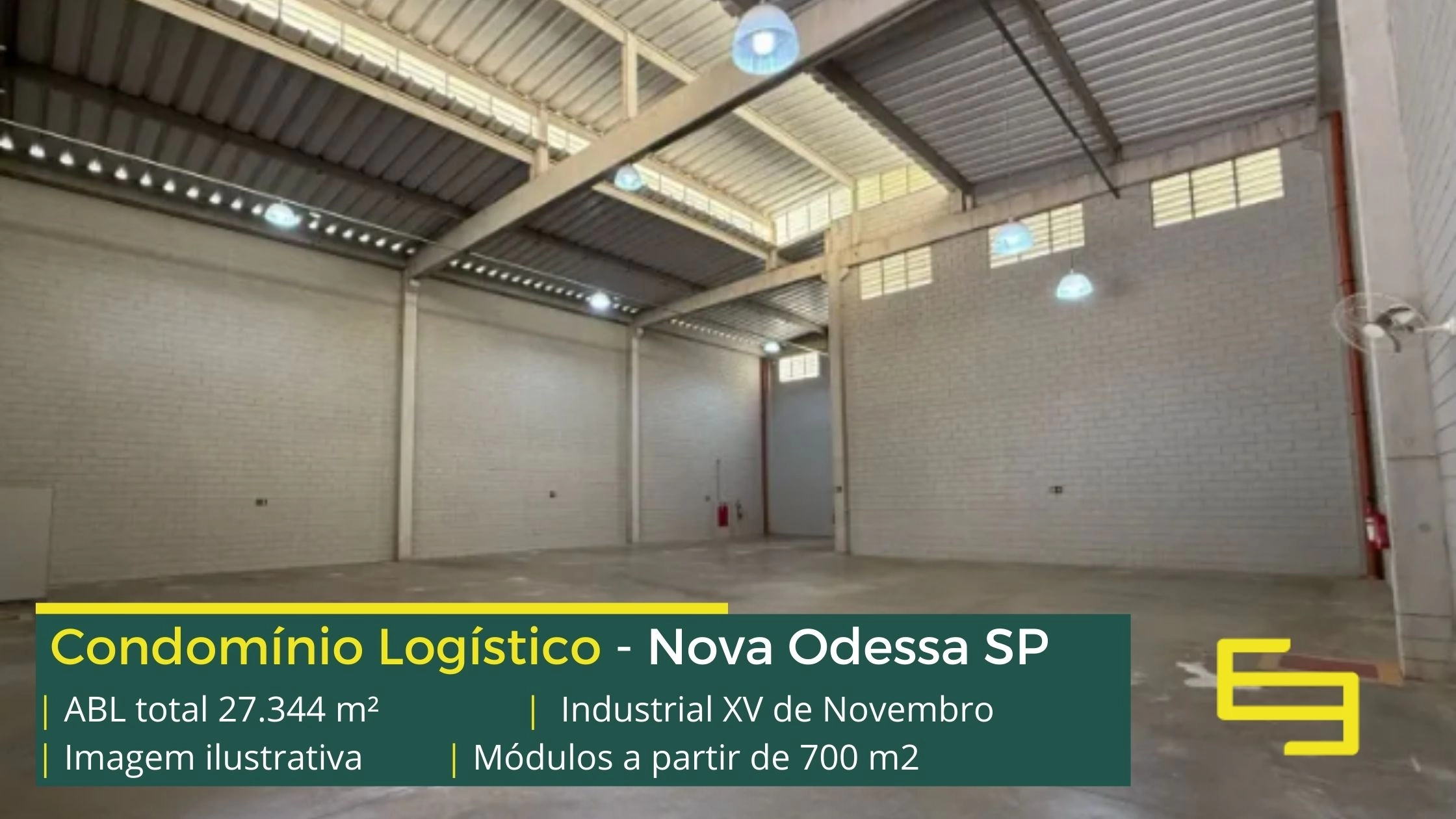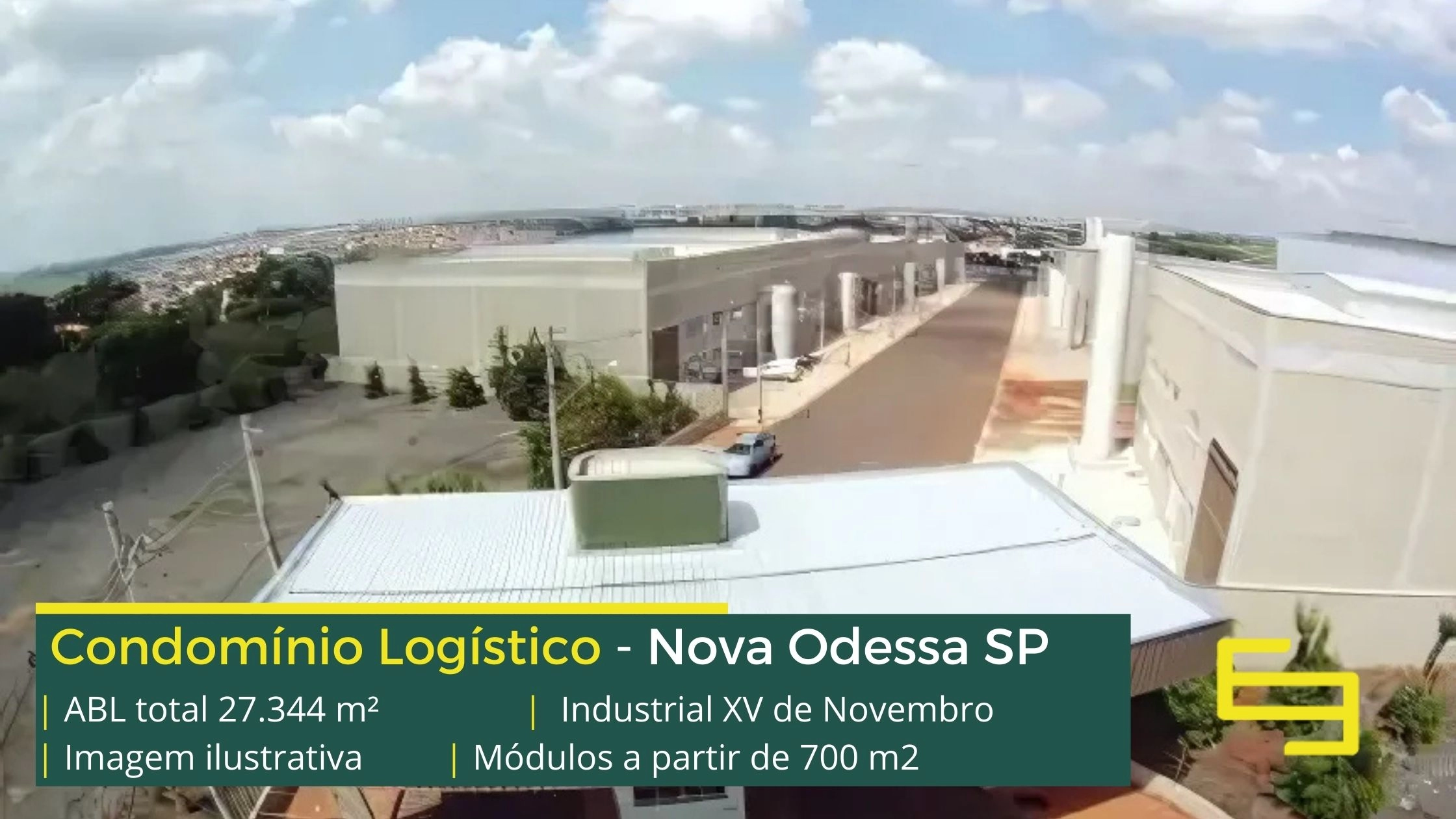 Aluguel de galpões em Nova Odessa em condomínio logístico localizado a 5,3 km da SP 304, e a 6,5 da Rodovia 330, e além disso com fácil acesso as cidades de Americana e Hortolândia, O condomínio industrial XV de novembro, conta com área total construída de 27.344 m² e que permite aluguel modular e flexível de galpão em Nova Odessa SP a partir de 700 m².