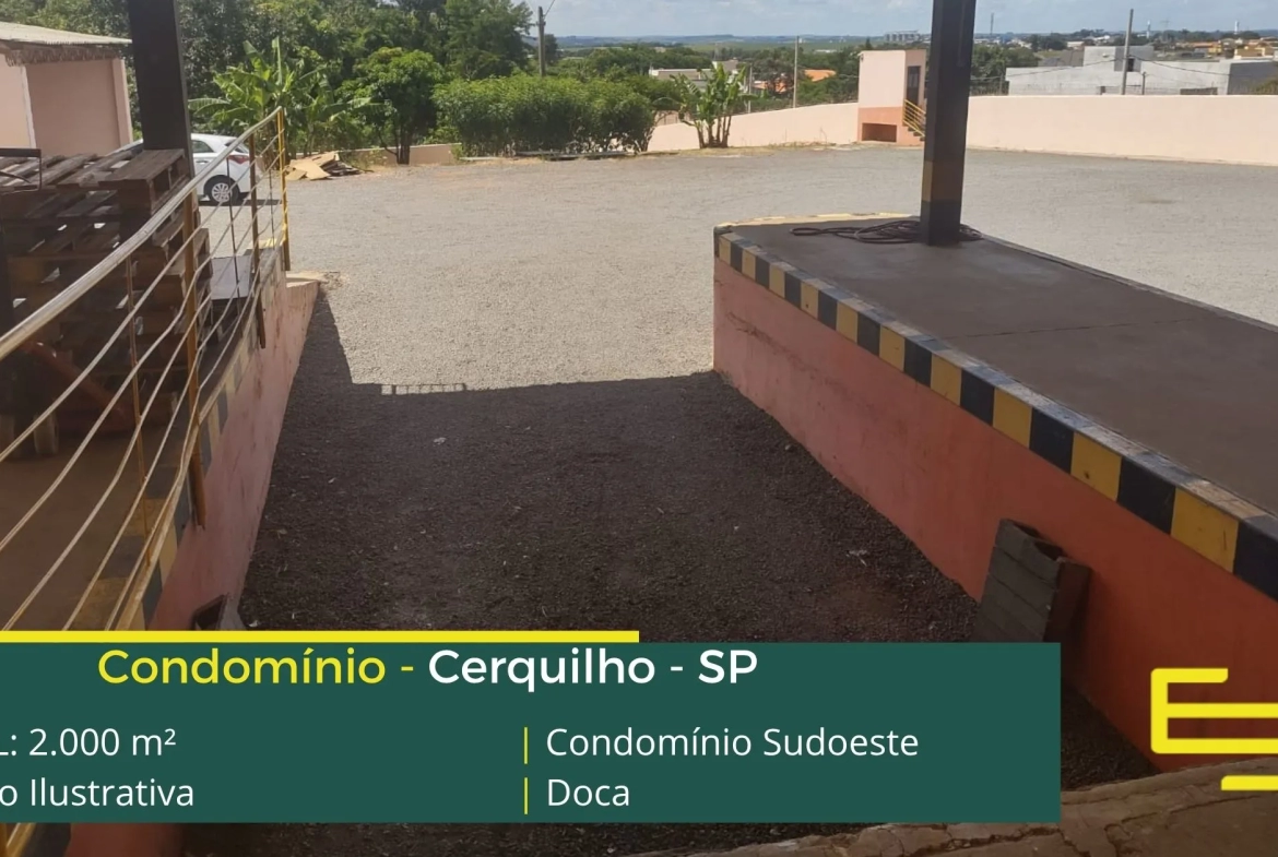 Galpão para alugar em Cerquilho SP em condomínio logístico com localização privilegiada, a um minuto da Rodovia Estadual SP-127, com fácil acesso a Rodovia Marechal Rondon e além disso, as cidades de Sorocaba e Tatuí. O condomínio Sudoeste conta com área total locável de 2.600 m² e permite aluguel de galpões em Cerquilho SP para logística e transportes.