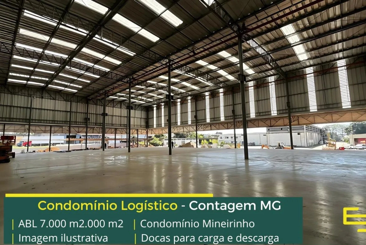 - Galpão para alugar em condomínio logístico em Contagem com docas para carga e descarga.