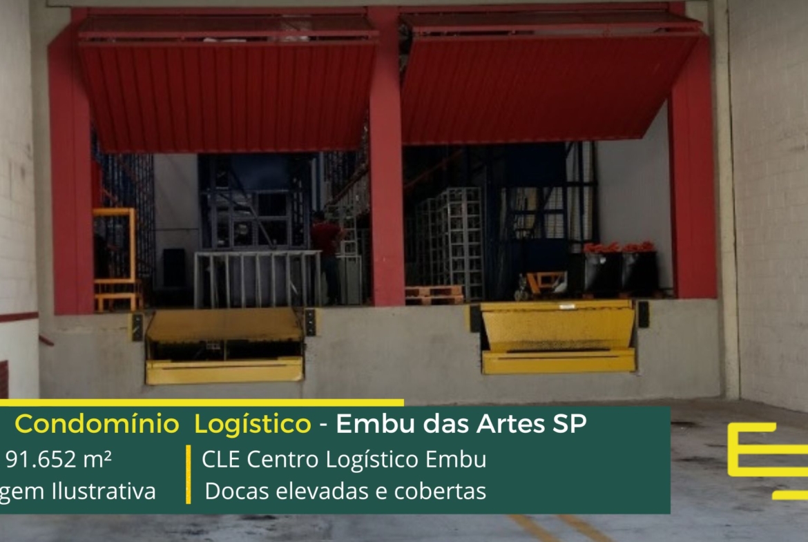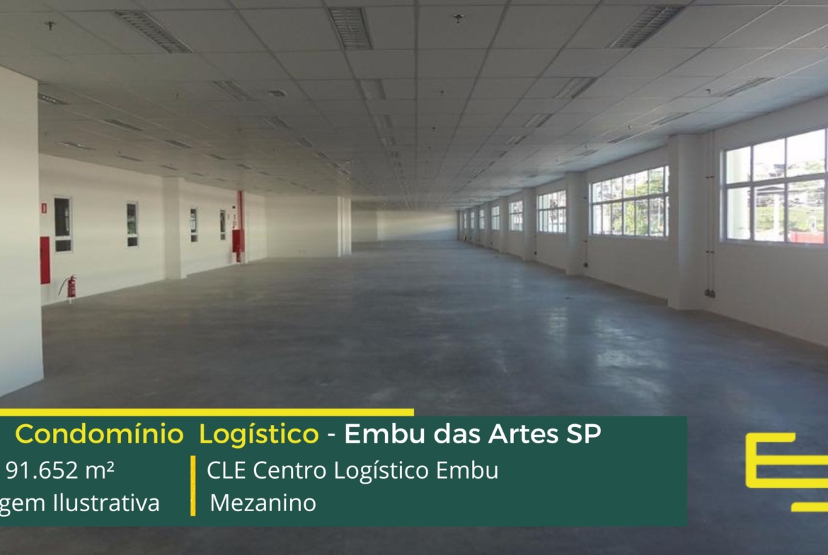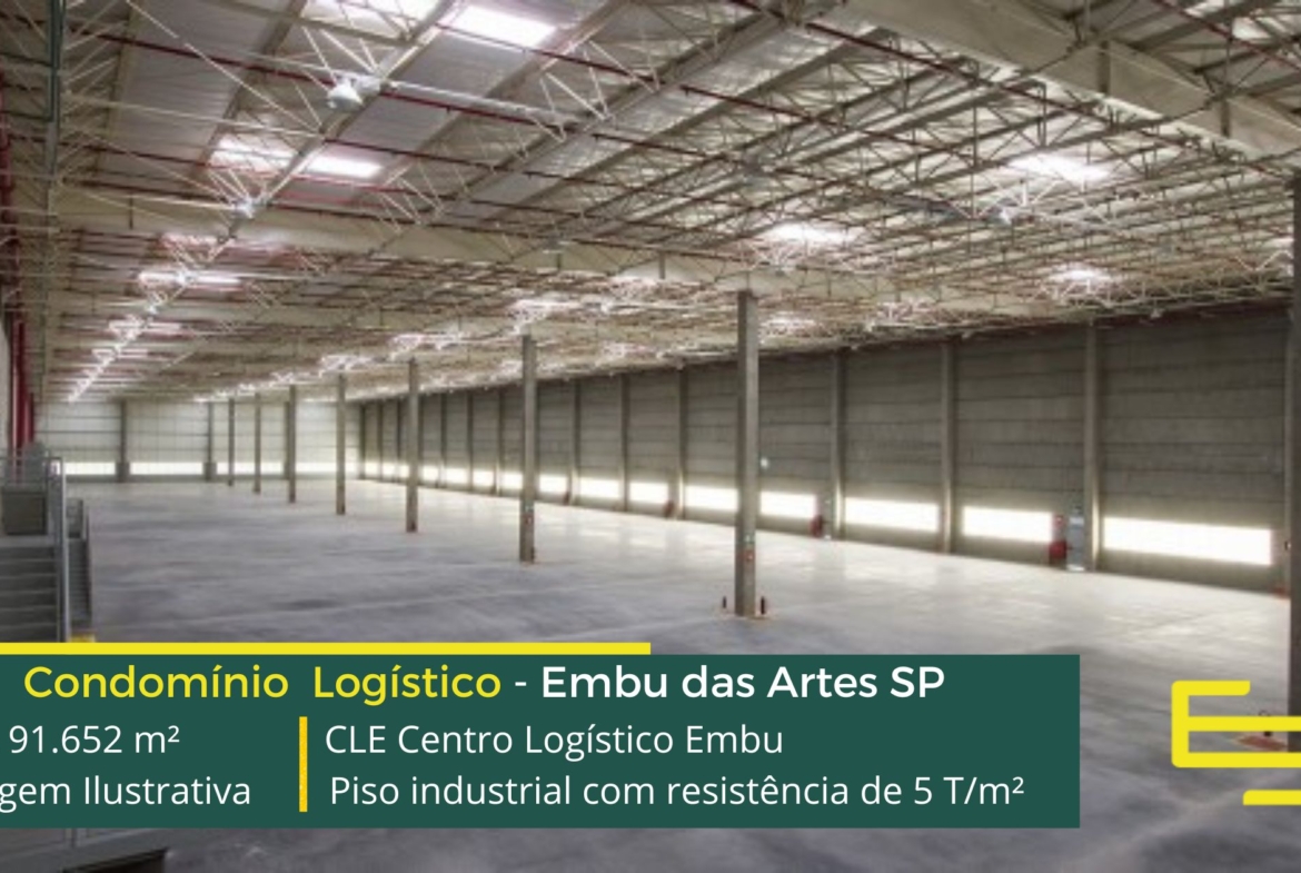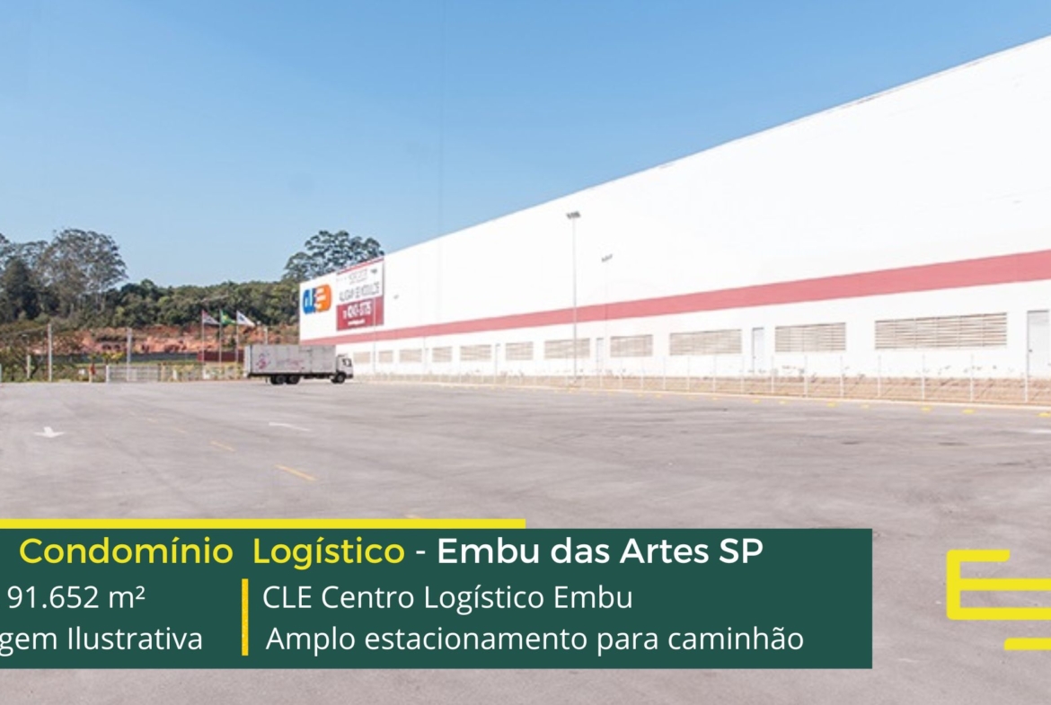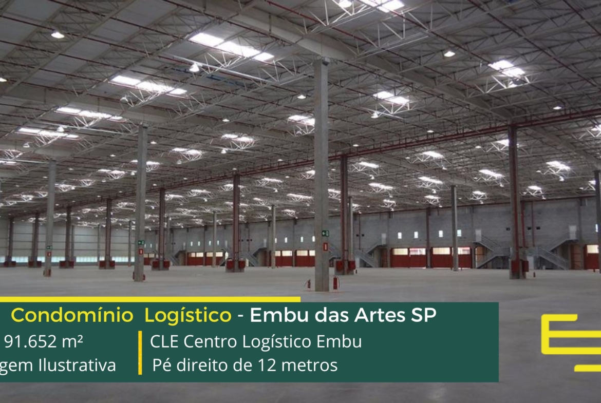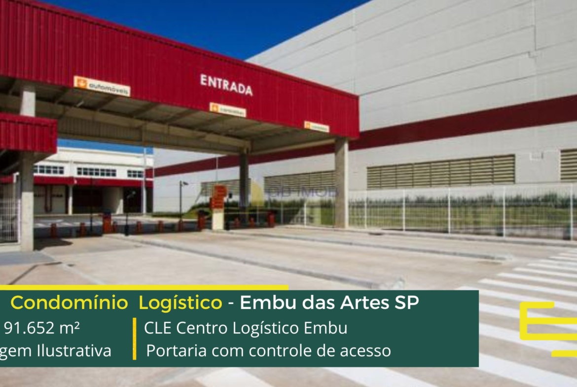 Galpão para alugar em Embu das Artes SP em condomínio logístico a aproximadamente a 500 metros do Rodoanel Mário Covas e 30 km do centro da cidade de São Paulo, com abastecimento facilitado para a região oeste da capital, O CLE Centro Logístico Embu possuí área total construída de 91.652 m² e que sobretudo, permite aluguel de galpões em Embu SP modulares e flexível a partir de 1.478 m².