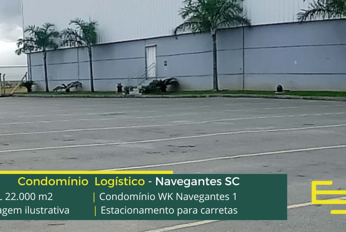 Em sua estrutura, este condomínio de galpões na cidade de Navegantes, estão presentes, estacionamento externo para automóveis e além disso, estacionamento interno para carretas.