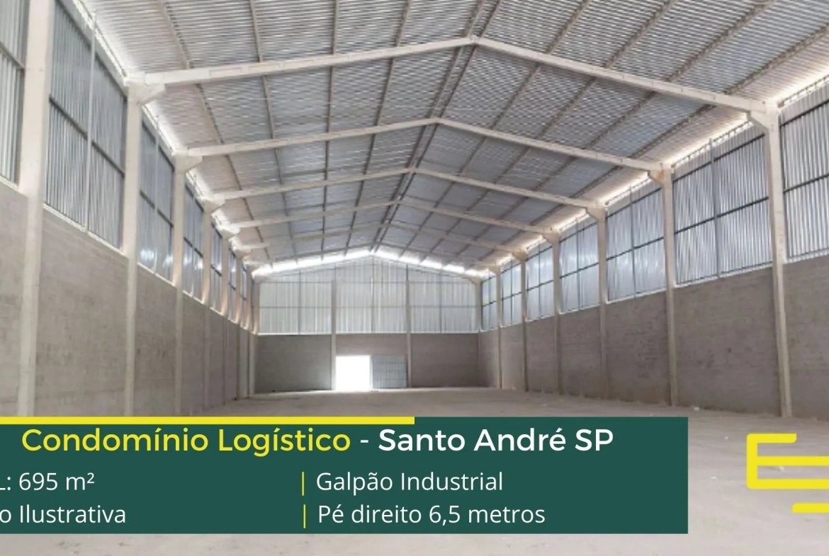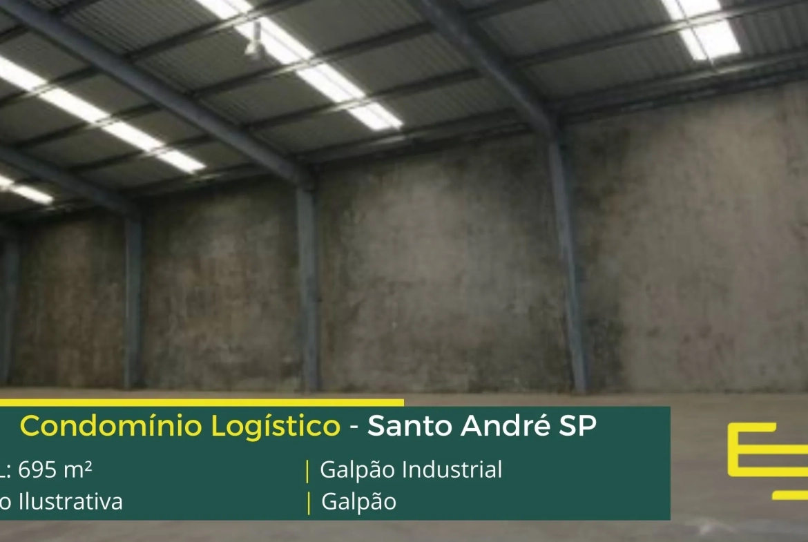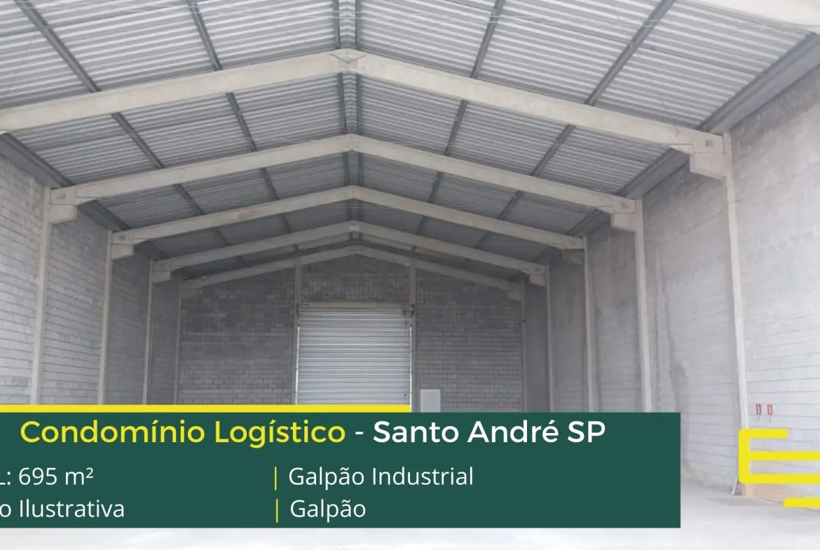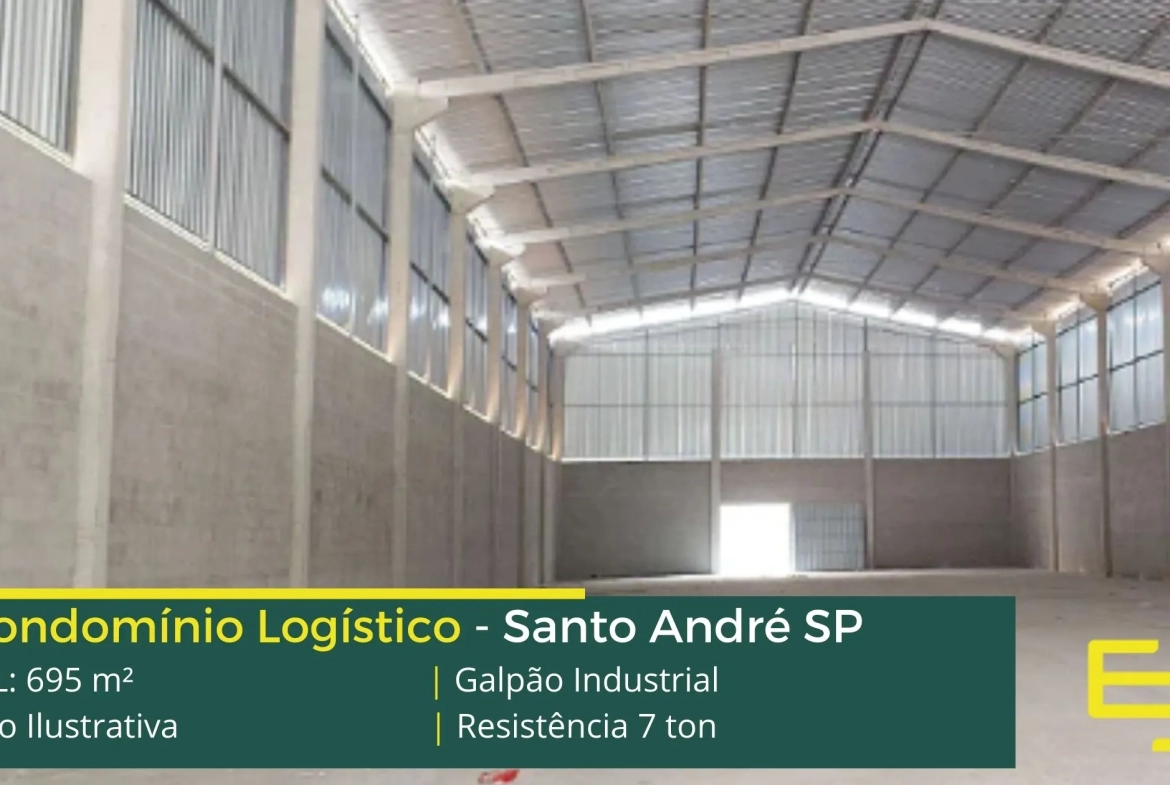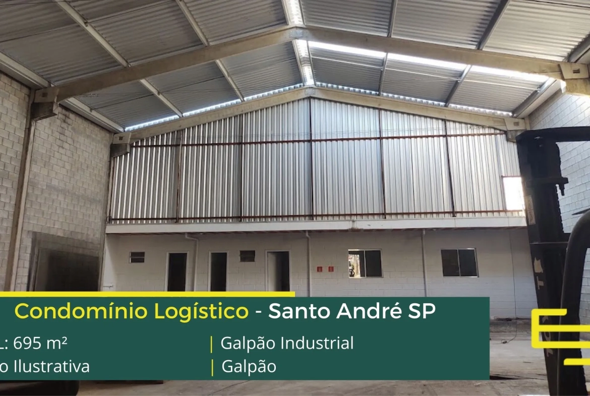 Galpão Industrial em Santo André – que é ideal para logística, transportes e além disso, distribuição, possui diferencial em sua localização, a 2,4 km da Av. dos Estados, este galpão para locação possuí área construída total de 695 m².