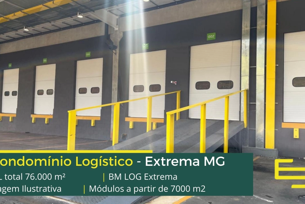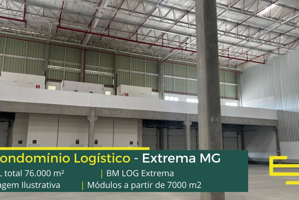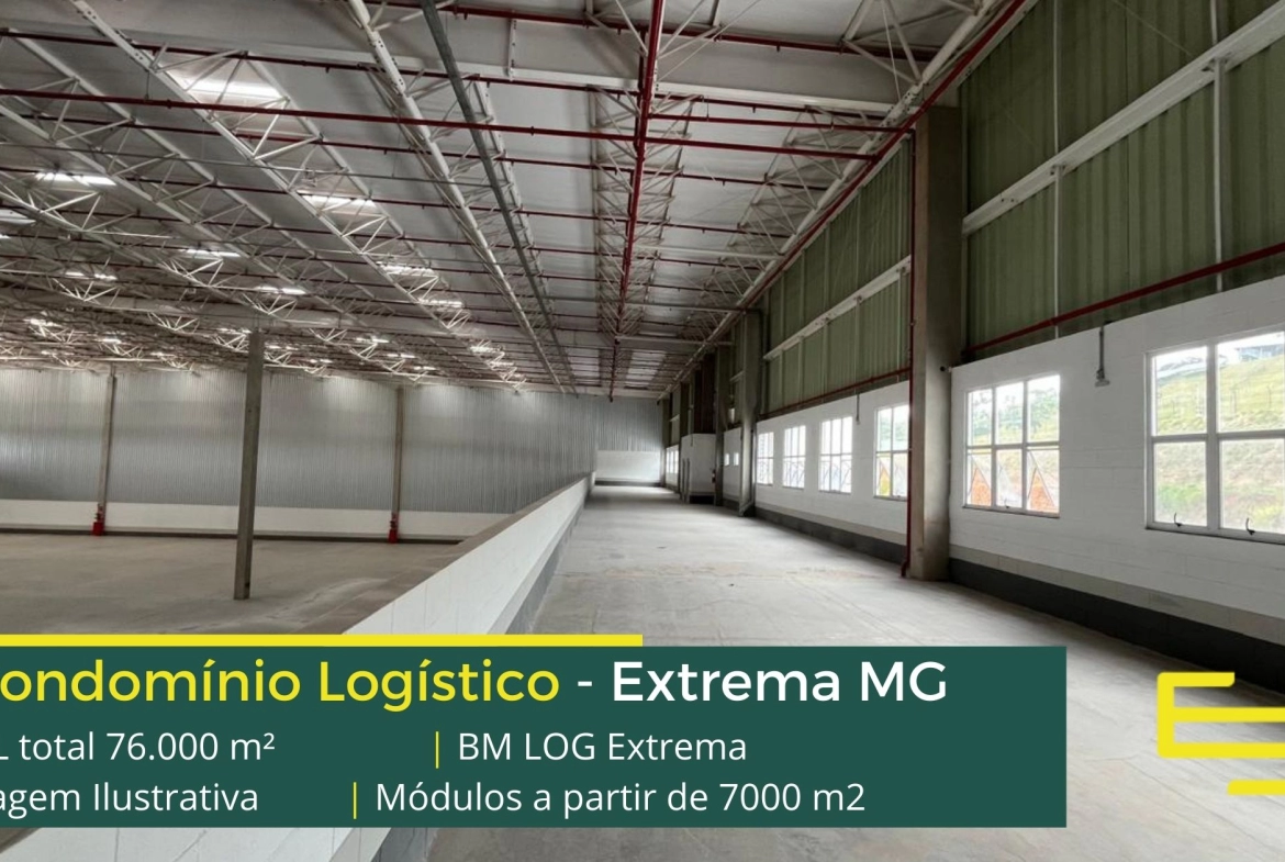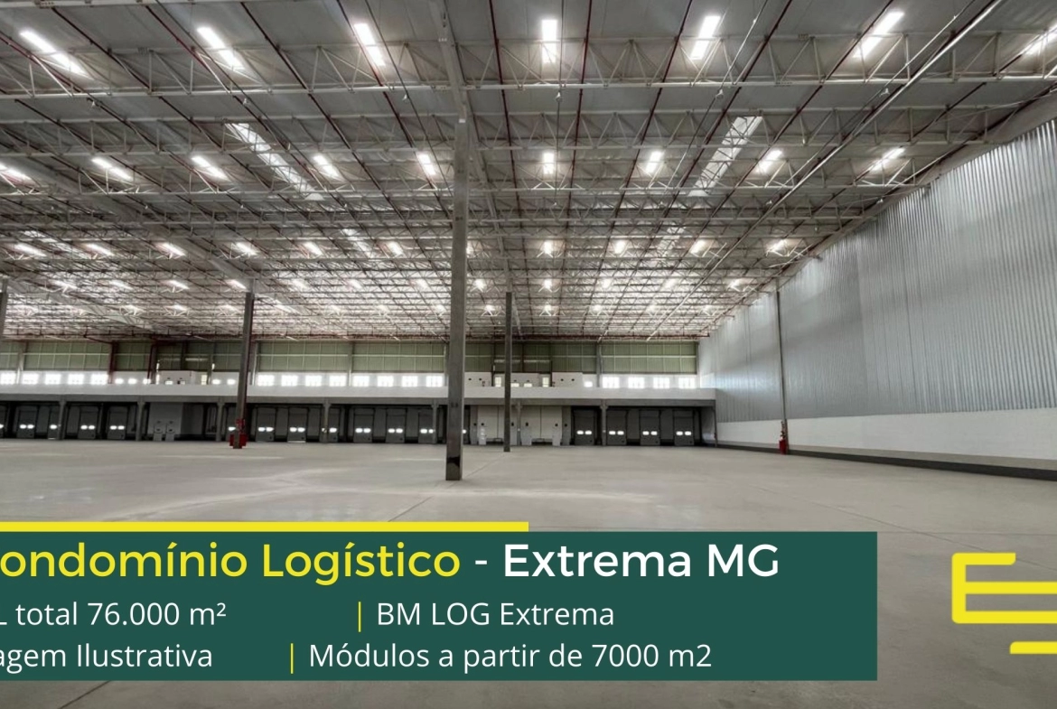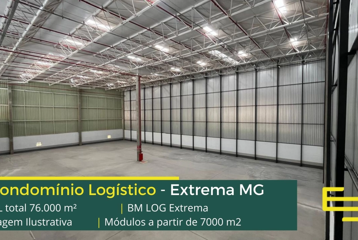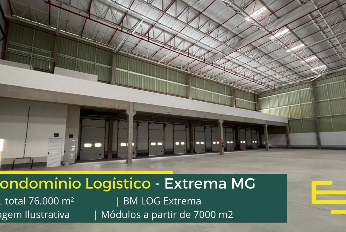 Galpão logístico para alugar em Extrema MG em condomínio com localização privilegiada, localizado a 2 min da Rodovia Fernão dias, próximo ao aeroporto de Bragança Paulista e com fácil acesso às cidades de Joanópolis e Vargem. O condomínio BM Log Extrema conta com área total locável de 76.878 m² e permite aluguel de galpões em Extrema a partir de 7000 m2.