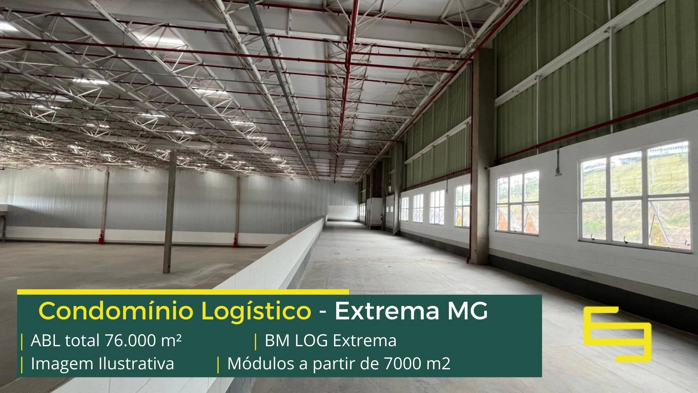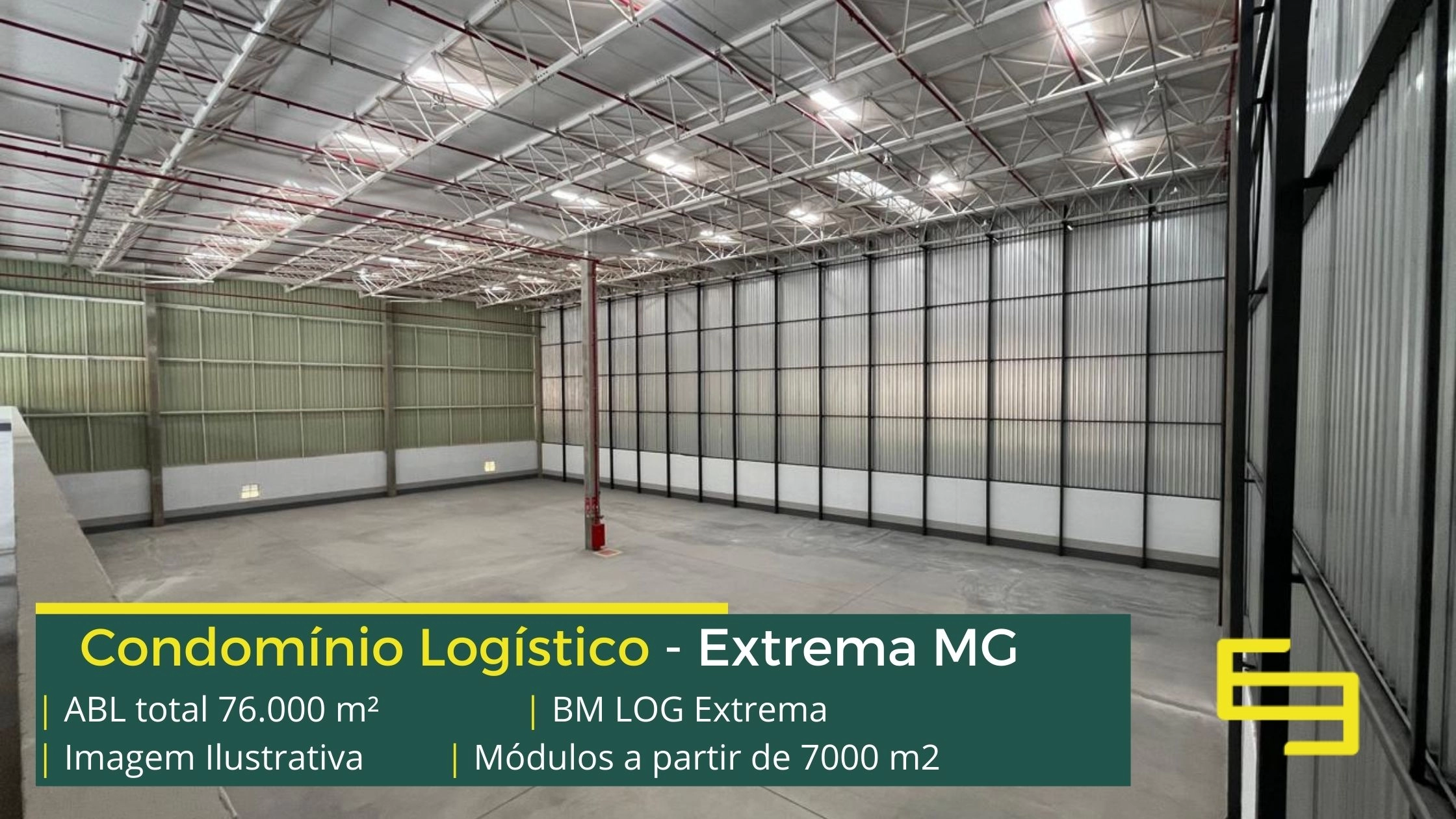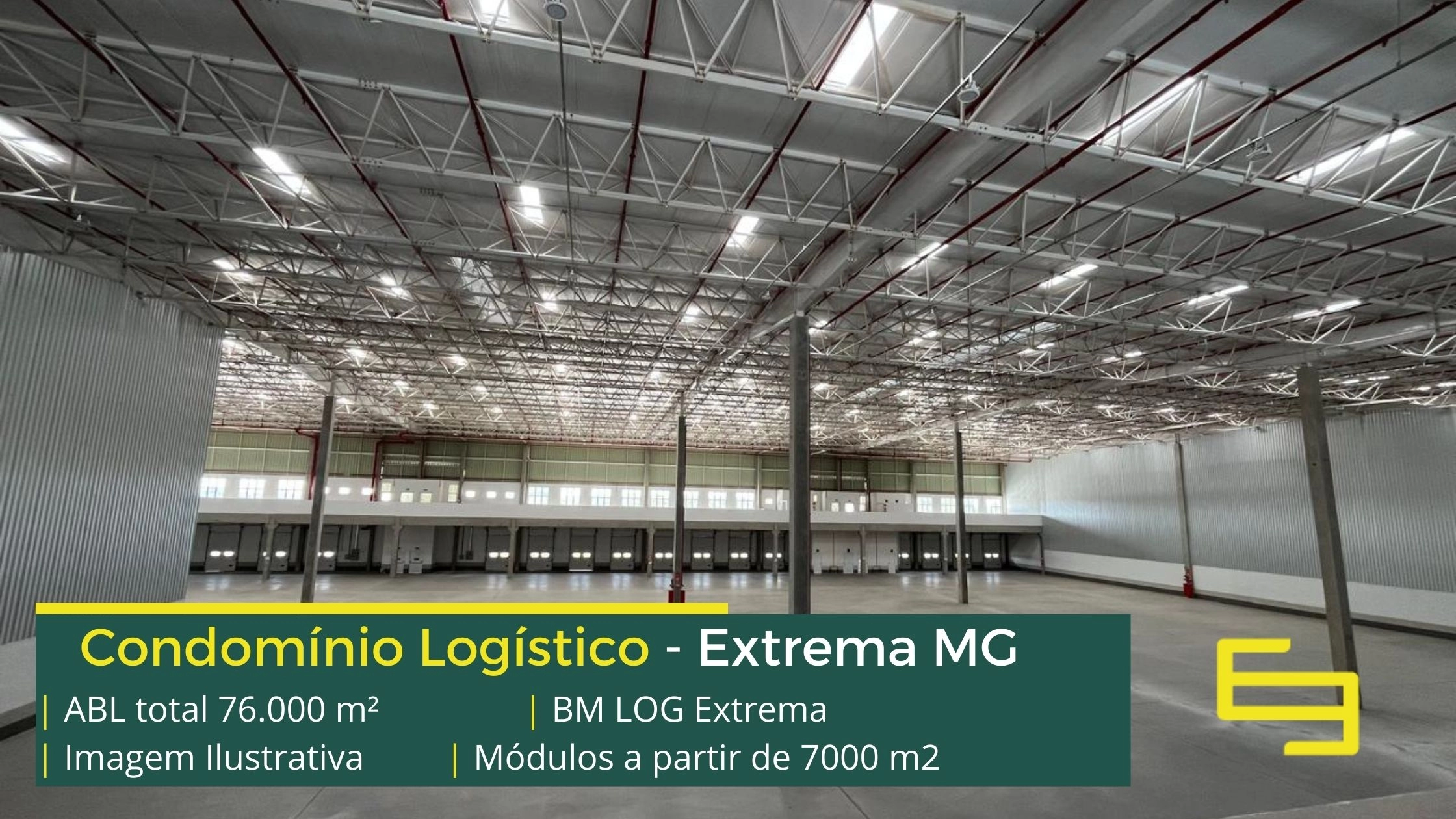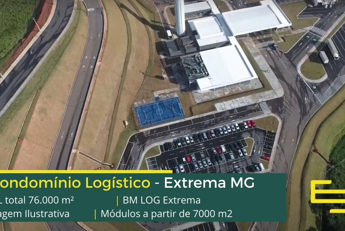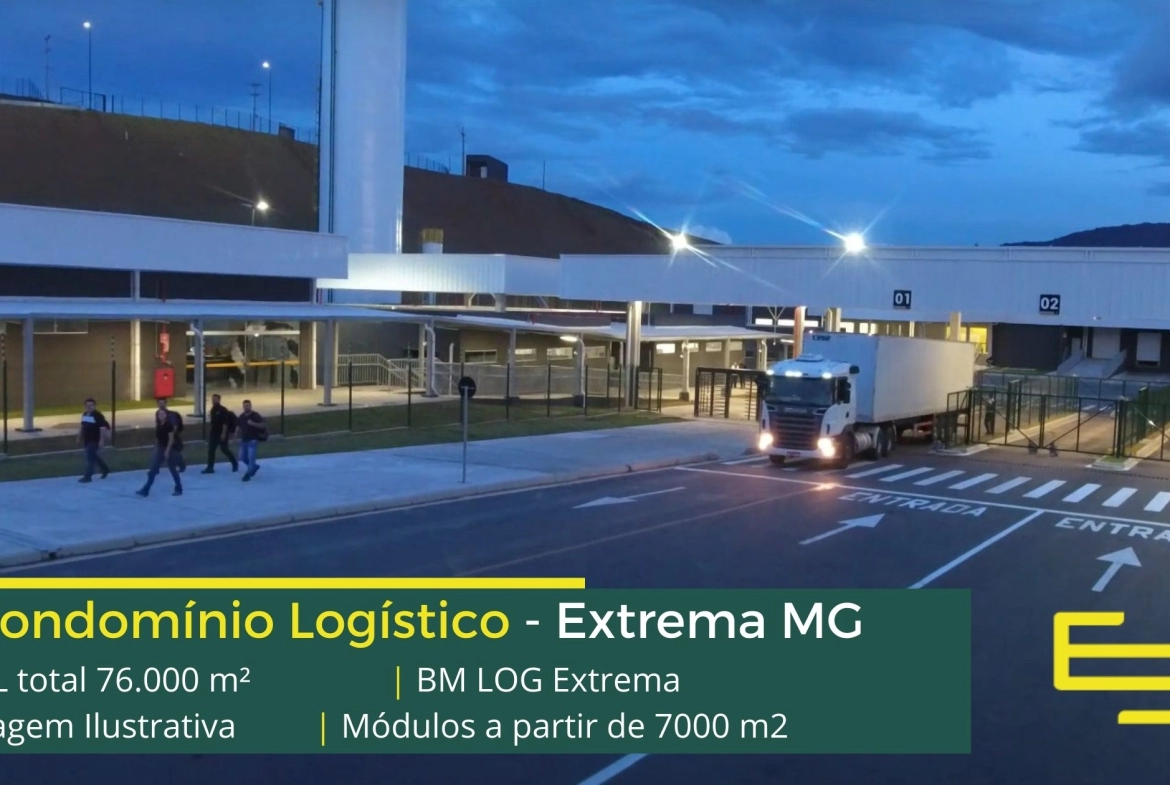 Galpão logístico para alugar em Extrema MG em condomínio com localização privilegiada, localizado a 2 min da Rodovia Fernão dias, próximo ao aeroporto de Bragança Paulista e com fácil acesso às cidades de Joanópolis e Vargem. O condomínio BM Log Extrema conta com área total locável de 76.878 m² e permite aluguel de galpões em Extrema a partir de 7000 m2.