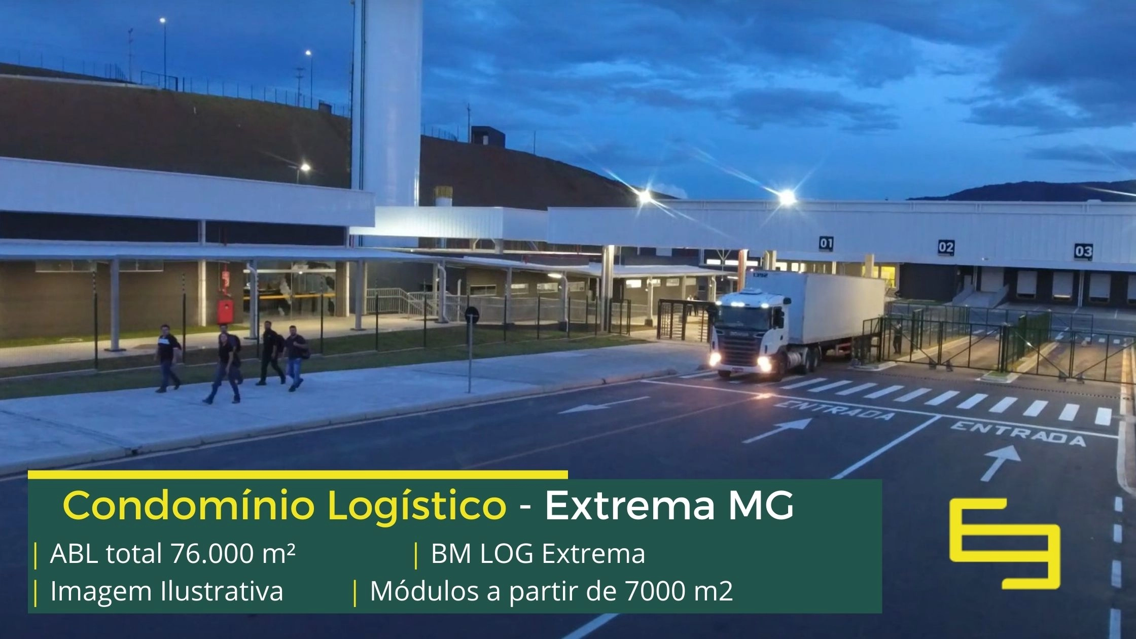 Galpão em condomínio logístico em Extrema MG que conta com portaria com segurança 24 horas, estacionamento para automóveis e carretas e galpões com docas para carga e descarga.
