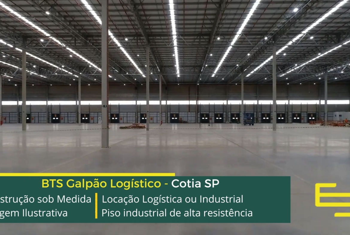 - Galpão para alugar em Cotia com piso industrial além disso, de alta resistência.