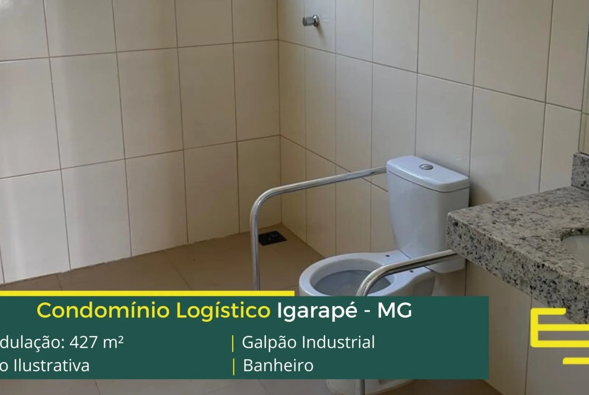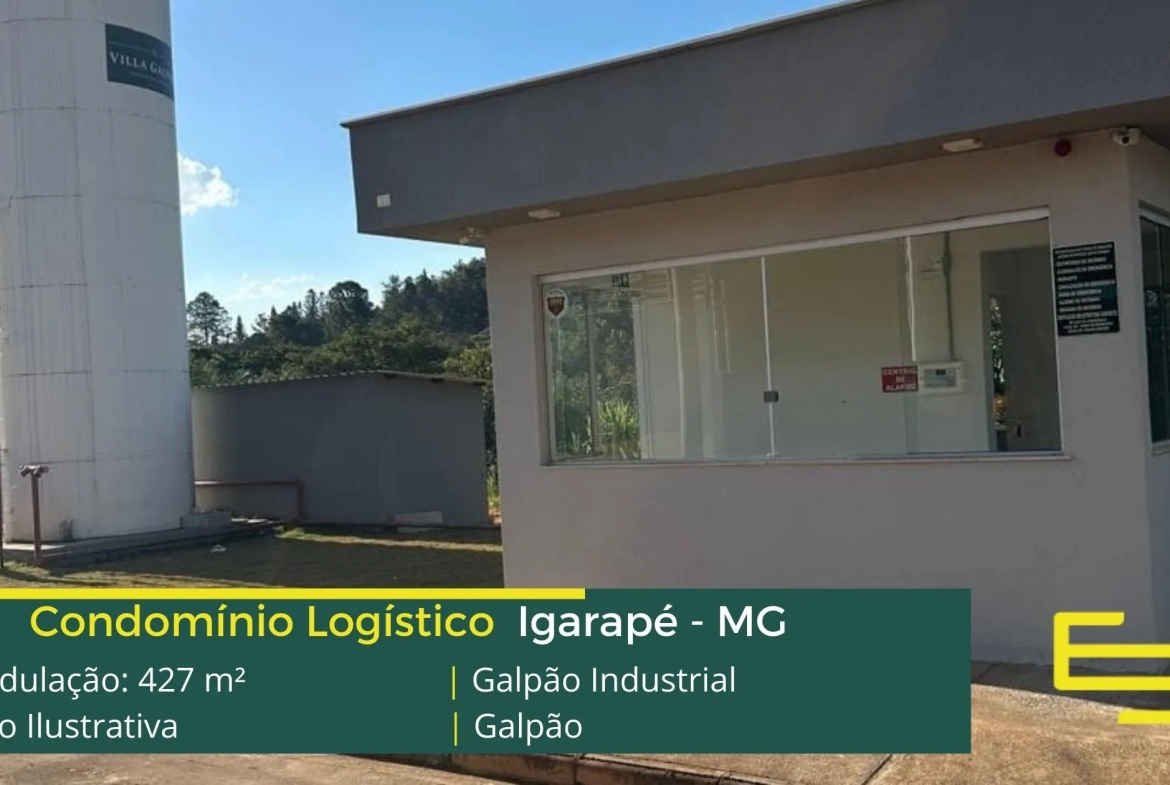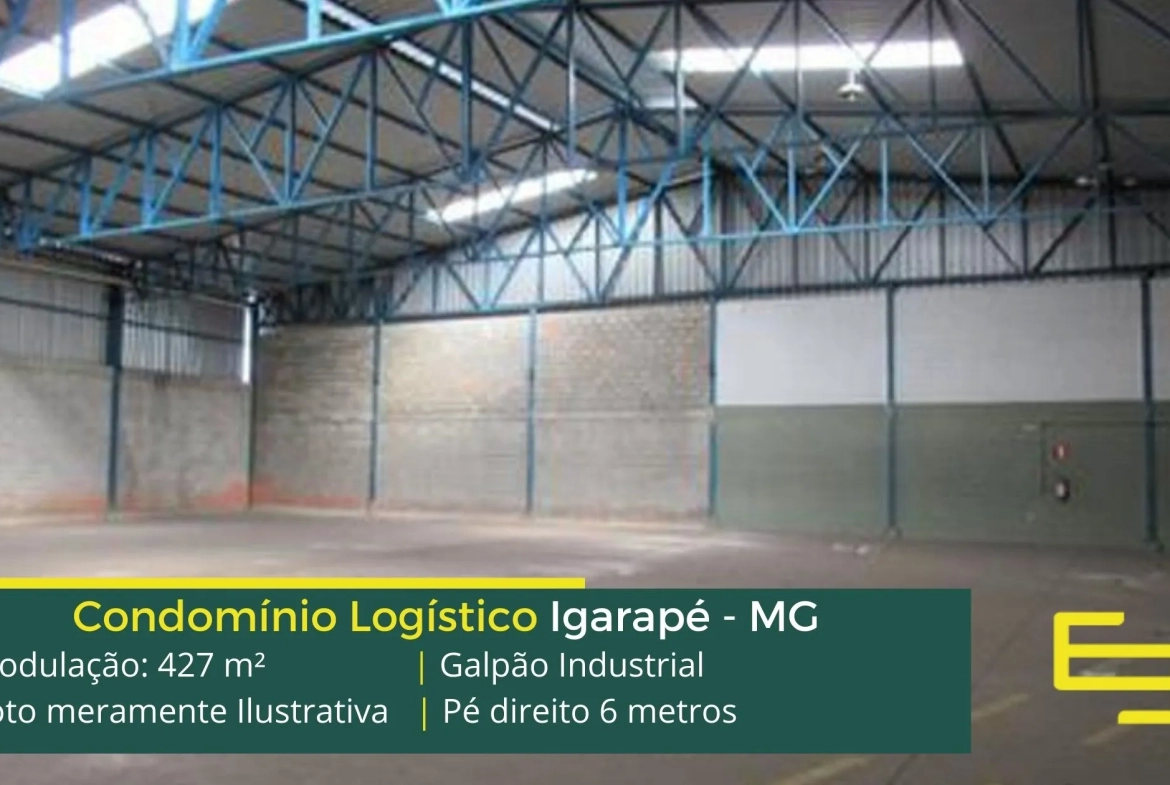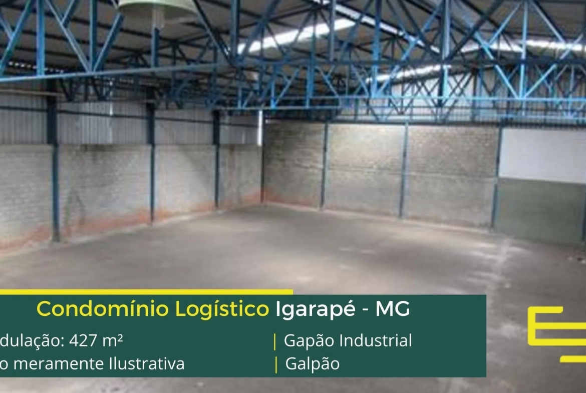 Galpão para alugar em Igarapé – que é ideal para logística, transportes e além disso, distribuição, possui diferencial em sua localização, a 7,3 km da Rodovia Fernão Dias, este galpão para locação possuí modulação de 427 m².