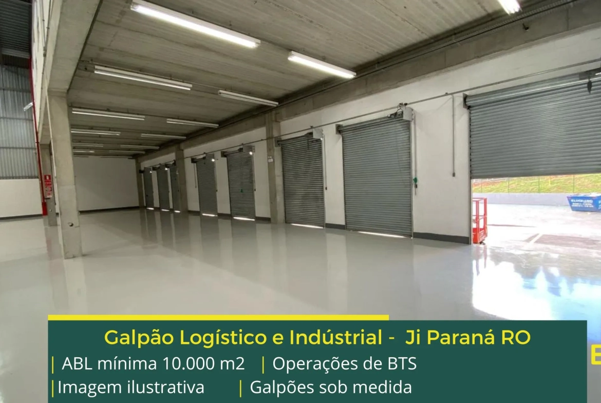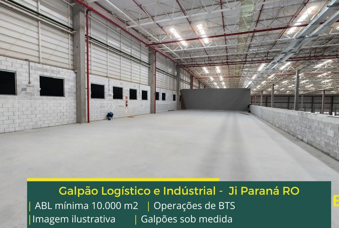 Galpão logístico e industrial para alugar em Ji Paraná RO com fácil acesso à Rodovia BR 070 e além disso, e a Rodovia MT 130 e as cidades de Rondonópolis e Cuiabá, a partir de 10.000 m2 de área bruta locável, podendo ser ocupado em fases. Podemos estudar modulação menor.