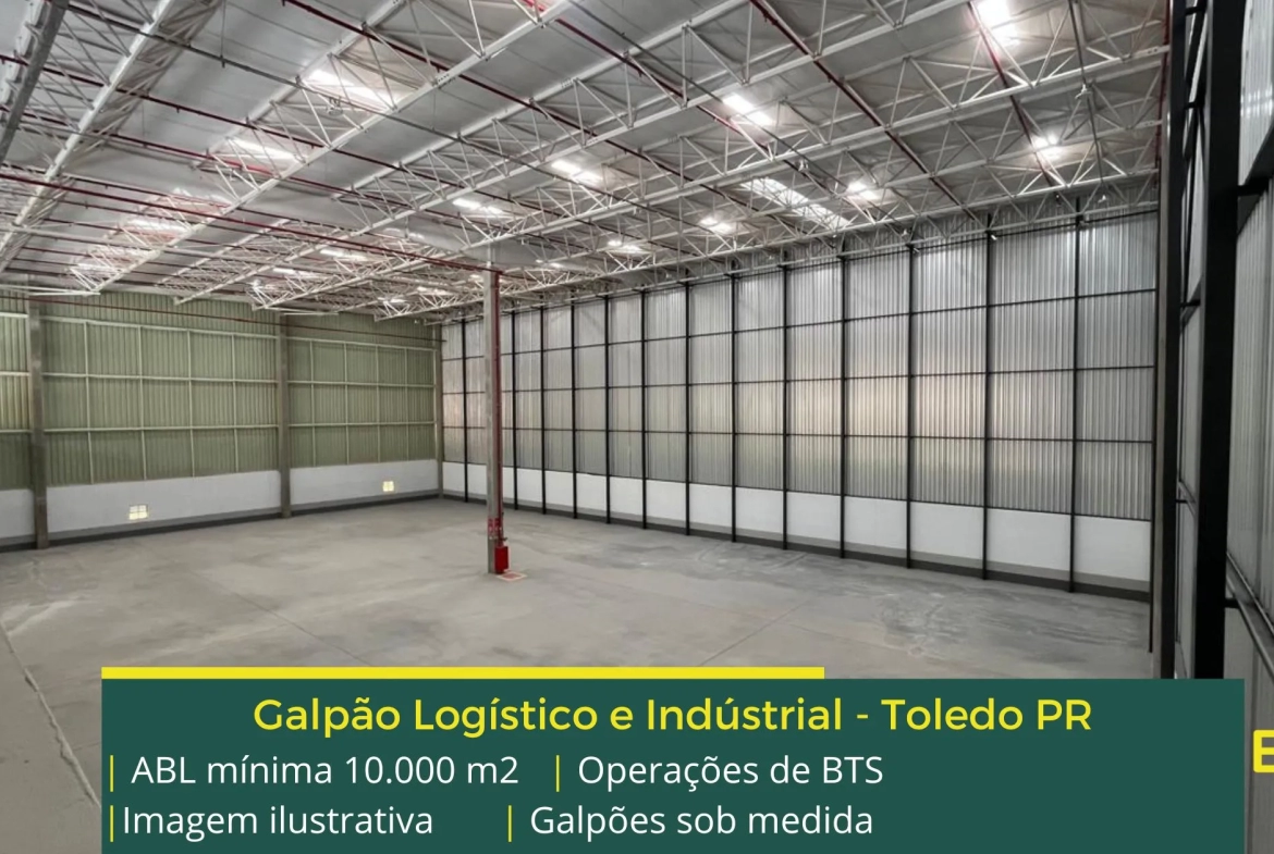 Galpão logístico e industrial para alugar em Toledo PR com fácil acesso à Rodovia PR 467 e além disso, e a Rodovia PR 182 e as cidades de Cascavel e Campo Mourão, a partir de 10.000 m2 de área bruta locável, podendo ser ocupado em fases. Podemos estudar modulação menor.