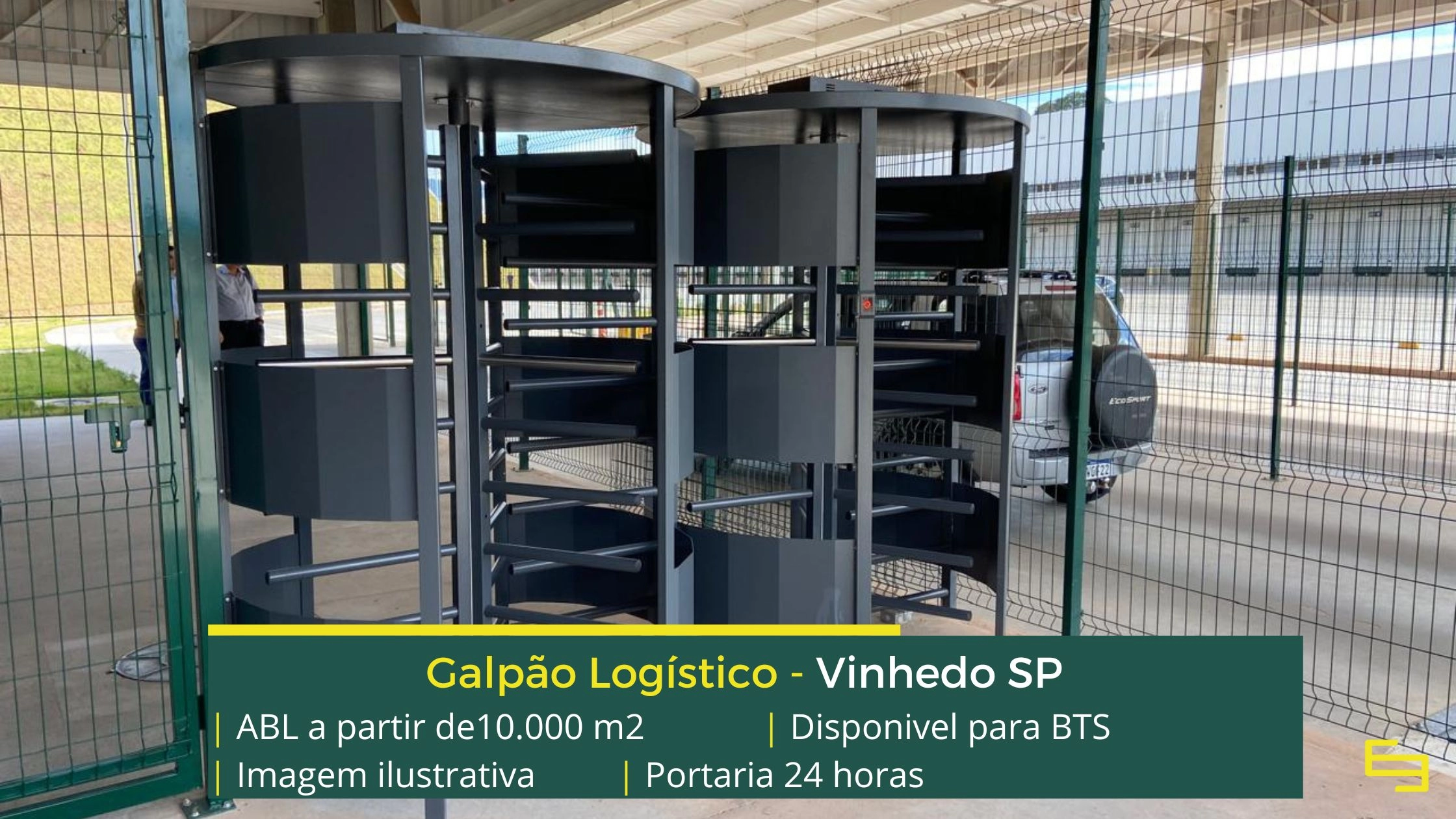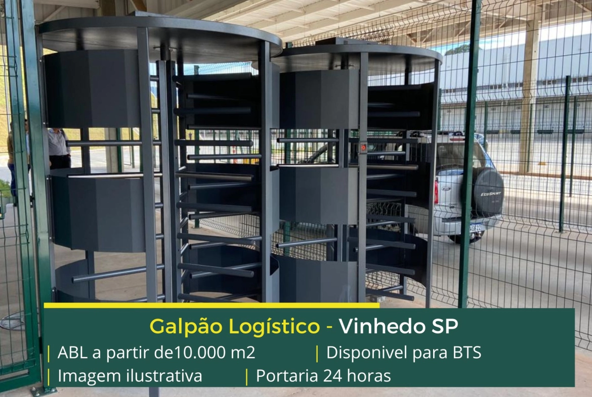 Galpão logístico e industrial para alugar em Vinhedo SP com completa estrutura de segurança. como portaria blindada e eclusas e além disso, possibilidade de docas com niveladoras e amplo pátio de manobras.