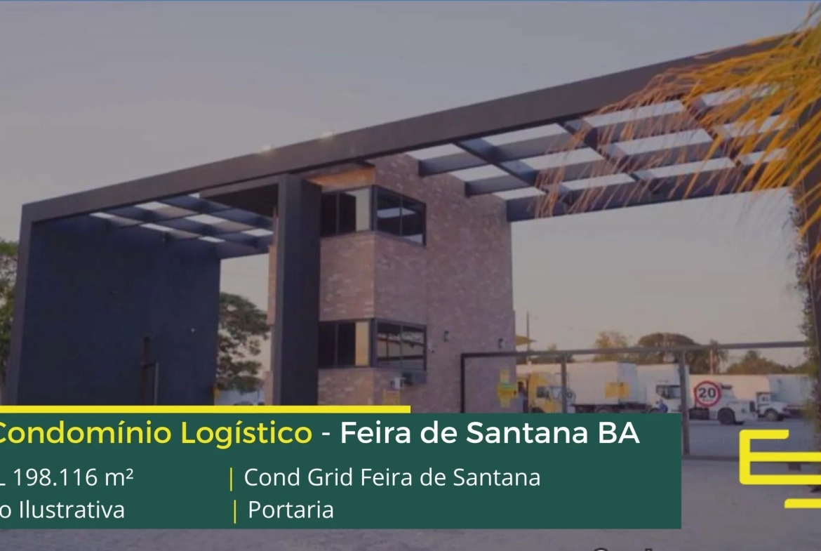 Aluguel de galpão em Feira de Santana BA, em condomínio logístico, entre as 5 importantes rodovias: BR 116, BR 503, BR 324, BR 101, e além disso, a BA 502, e com estrutura completa de segurança e galpões de alto padrão construtivo.