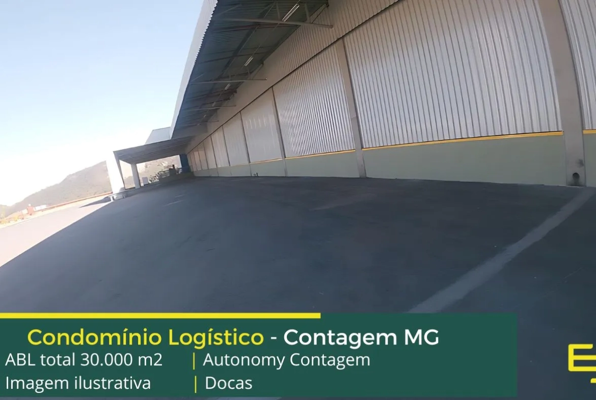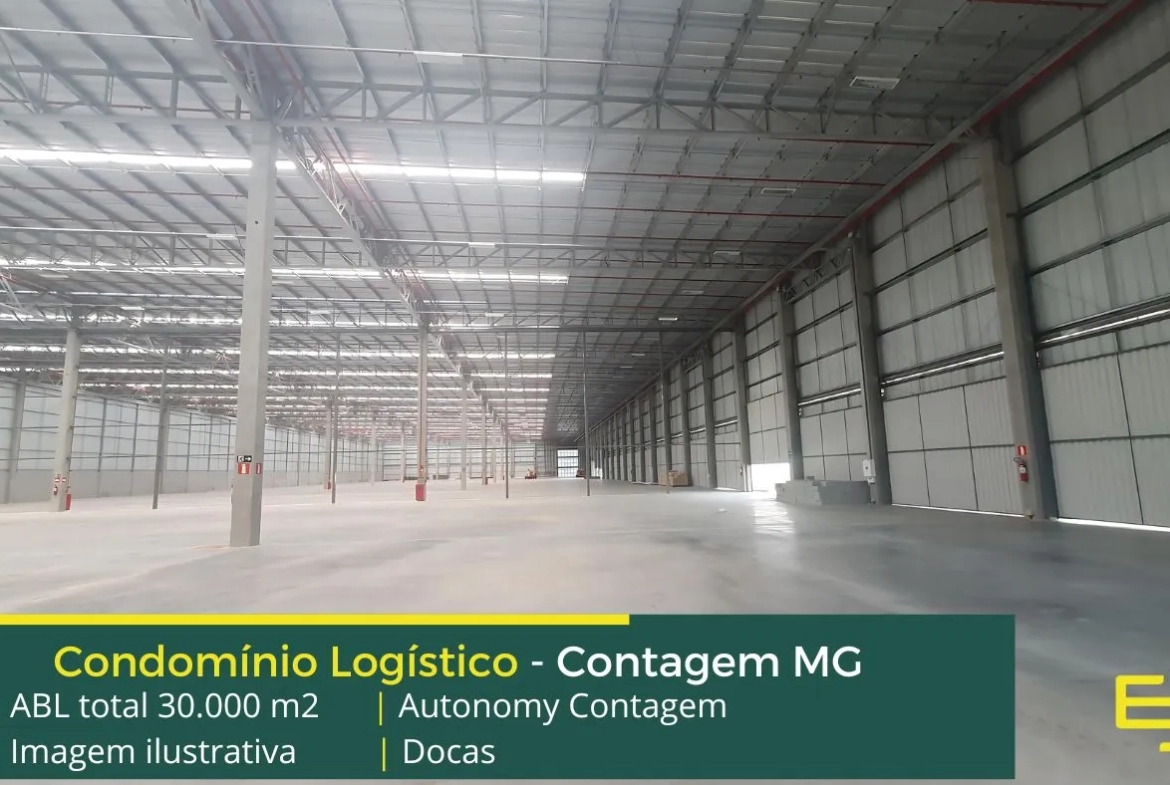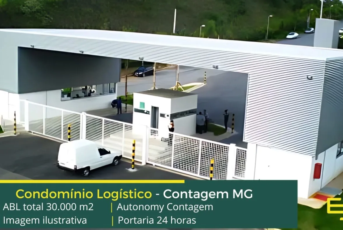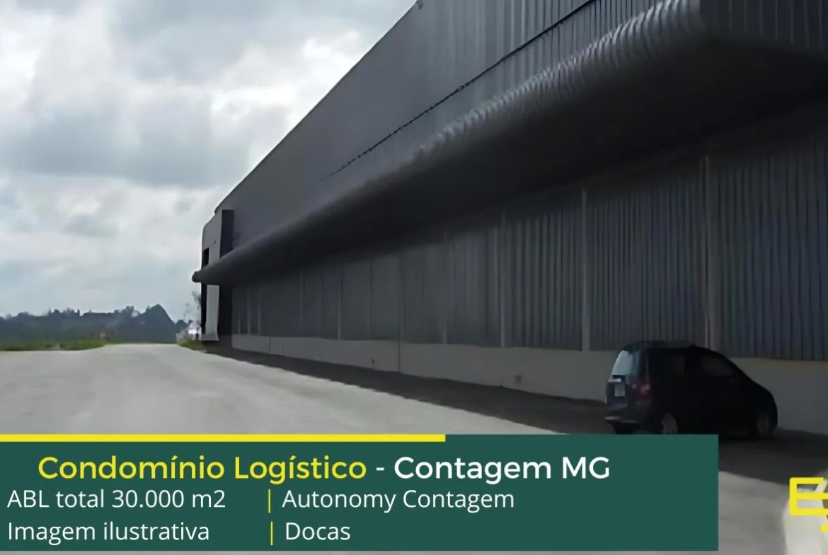 Aluguel de galpão em Contagem MG, em Condomínio logístico com portaria 24 horas, módulos com docas cross-docking, com amplo pátio para carretas e automóveis e além disso, com segurança e portaria e que possui localização estratégica com ligação para a BR040 e ao Ceasa.