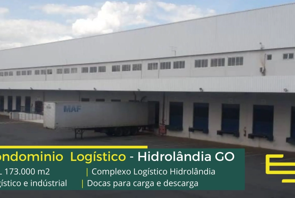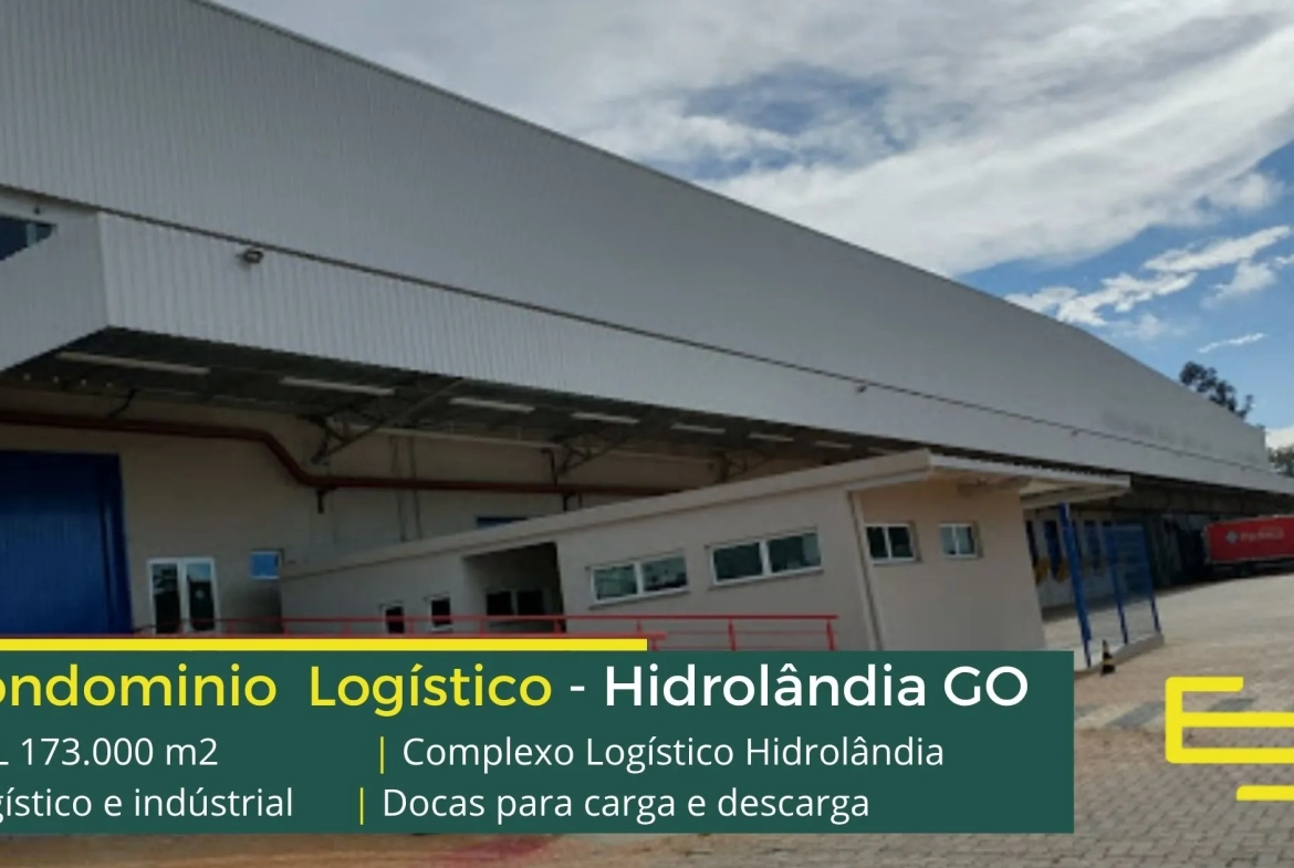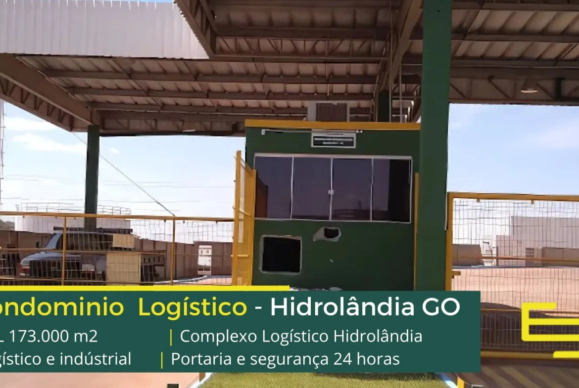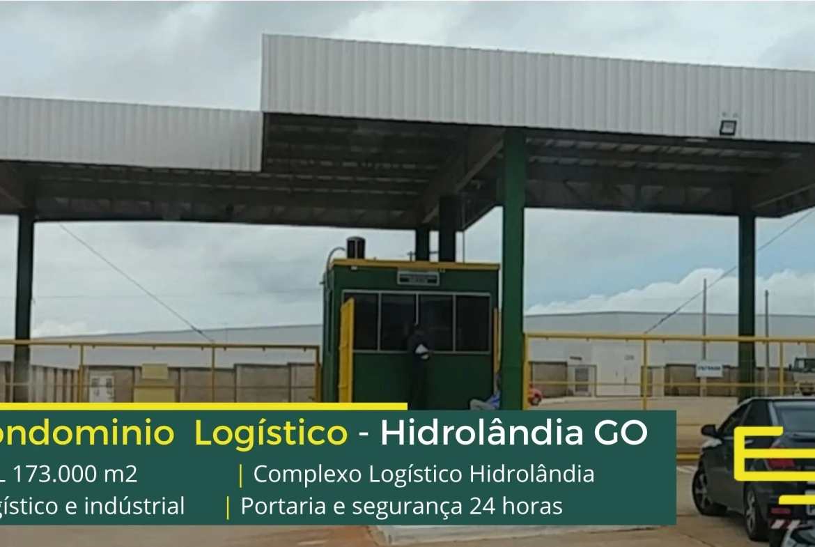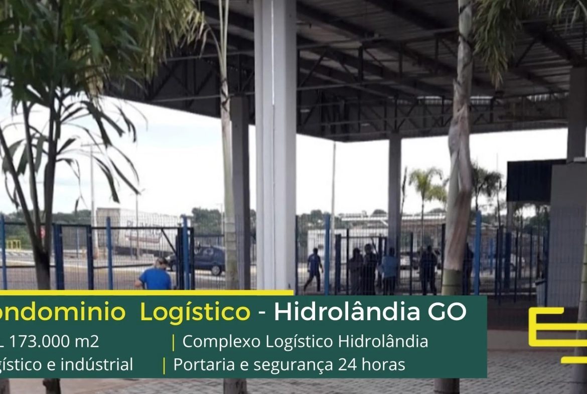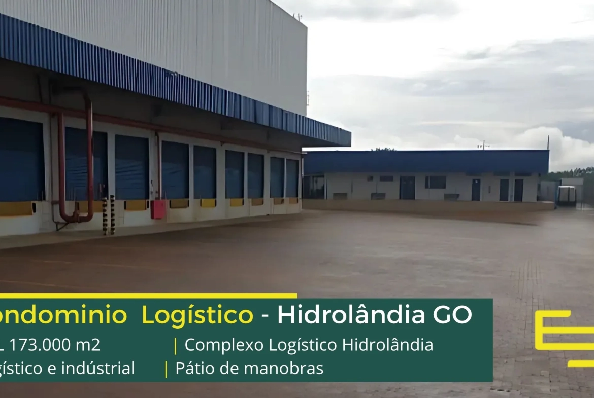 Galpão para alugar na cidade de Hidrolândia em condomínio logístico que conta com portaria com controle de acesso, monitoramento 24 horas, amplo pátio de manobras e além disso, galpões com docas, altura de 12 metros e com área administrativa.