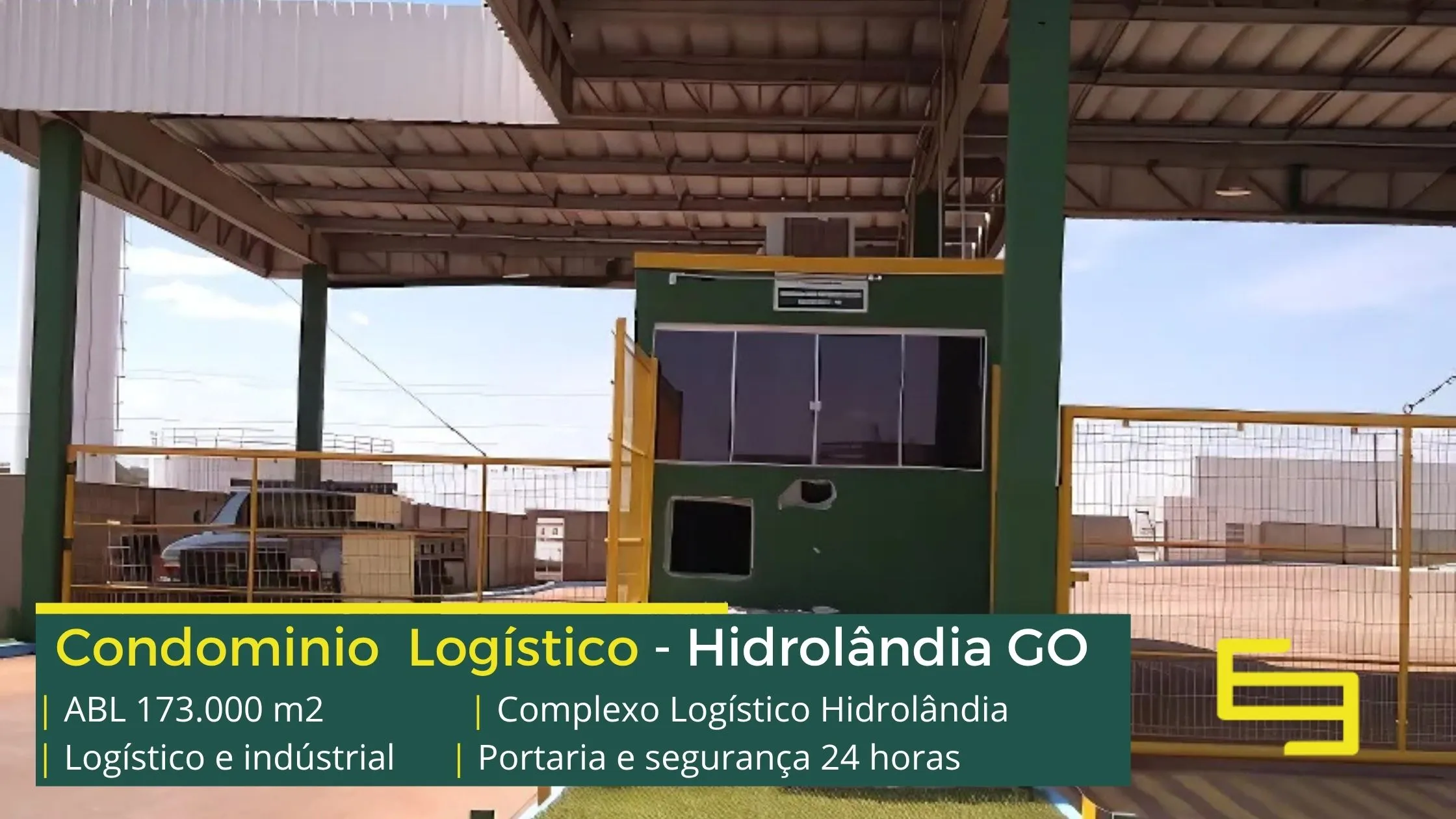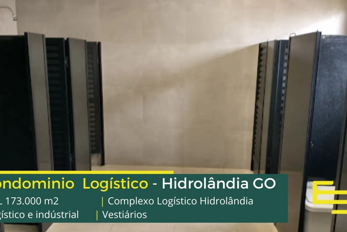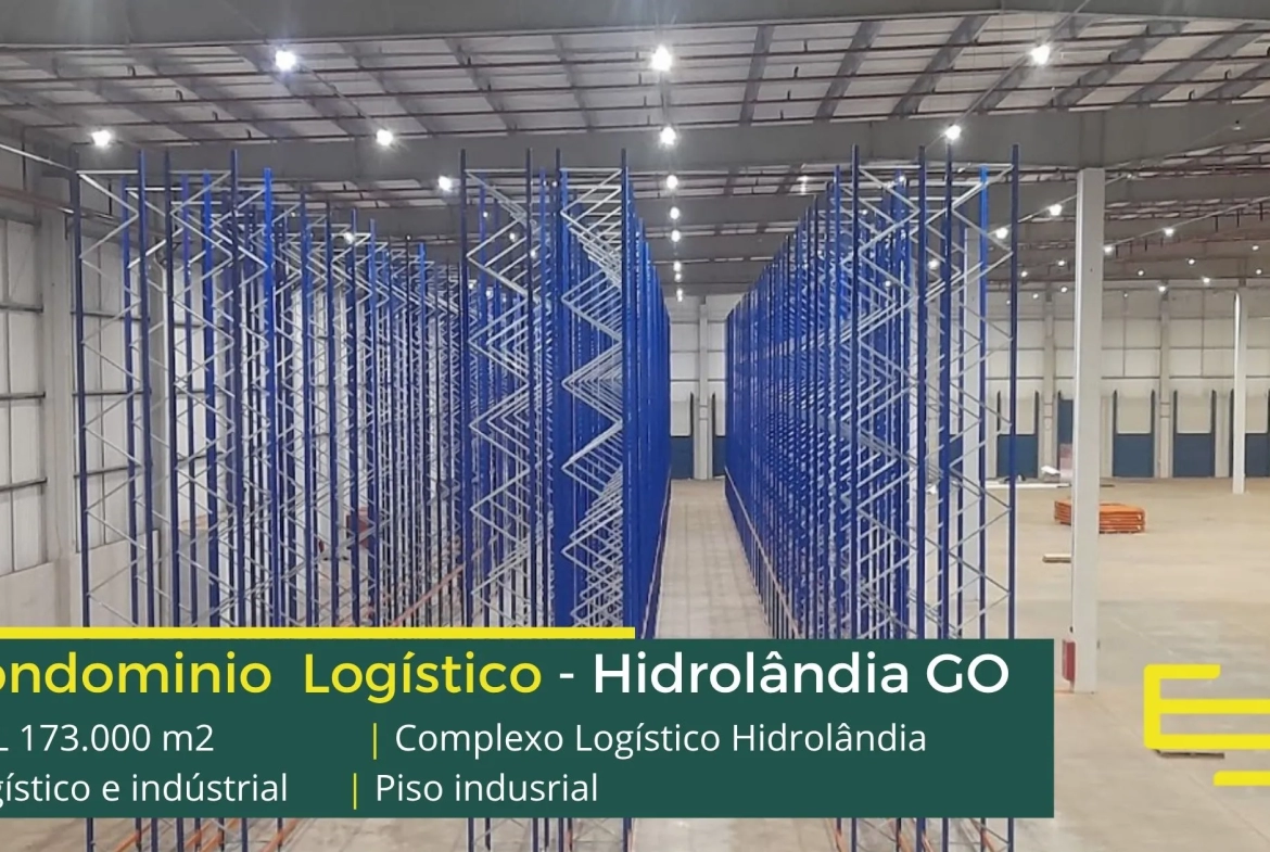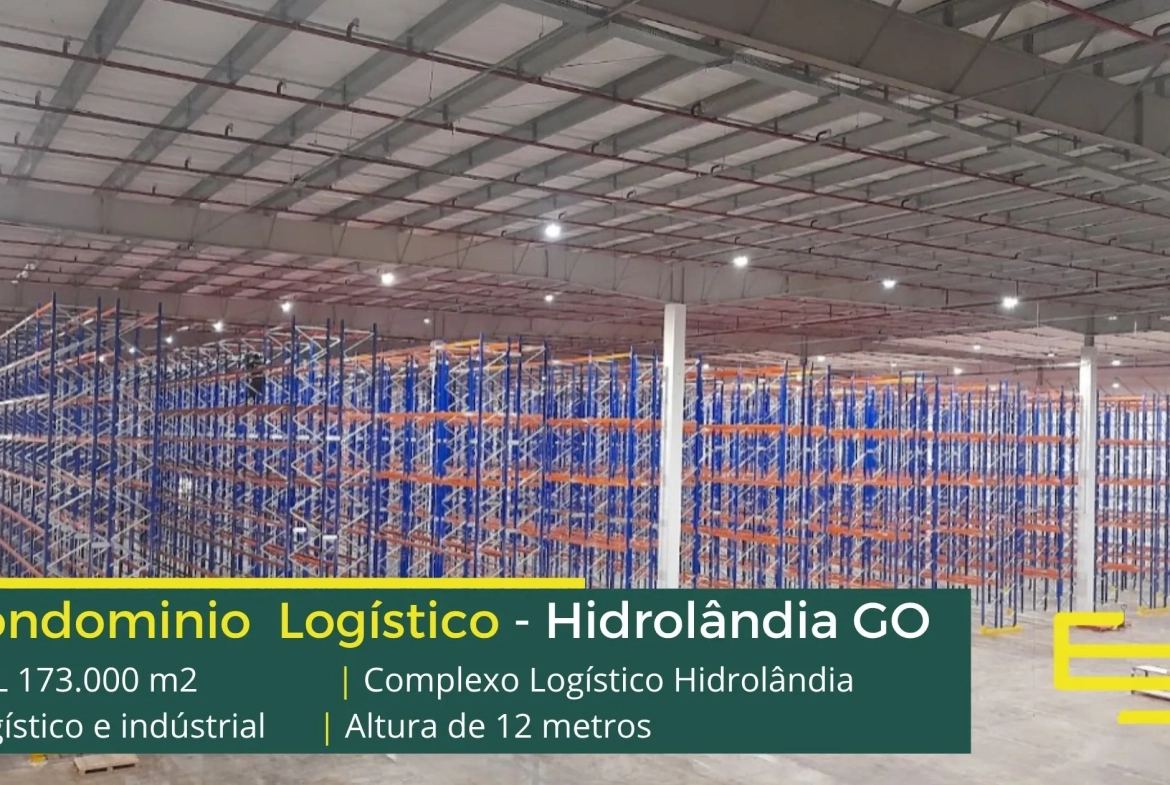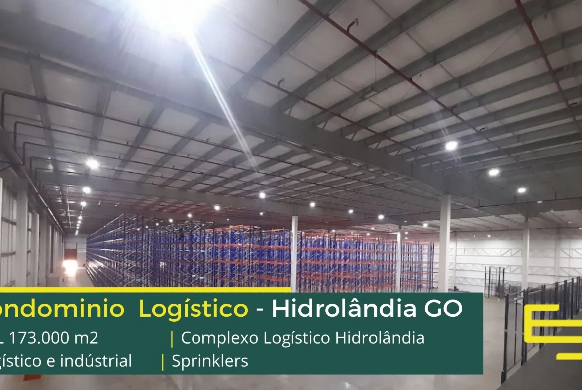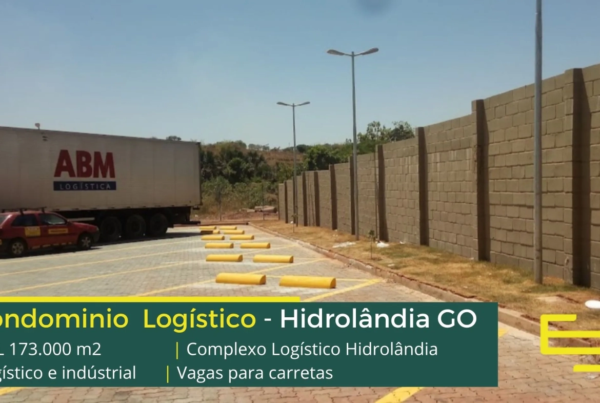 Galpão para alugar na cidade de Hidrolândia em condomínio logístico que conta com portaria com controle de acesso, monitoramento 24 horas, amplo pátio de manobras e além disso, galpões com docas, altura de 12 metros e com área administrativa.