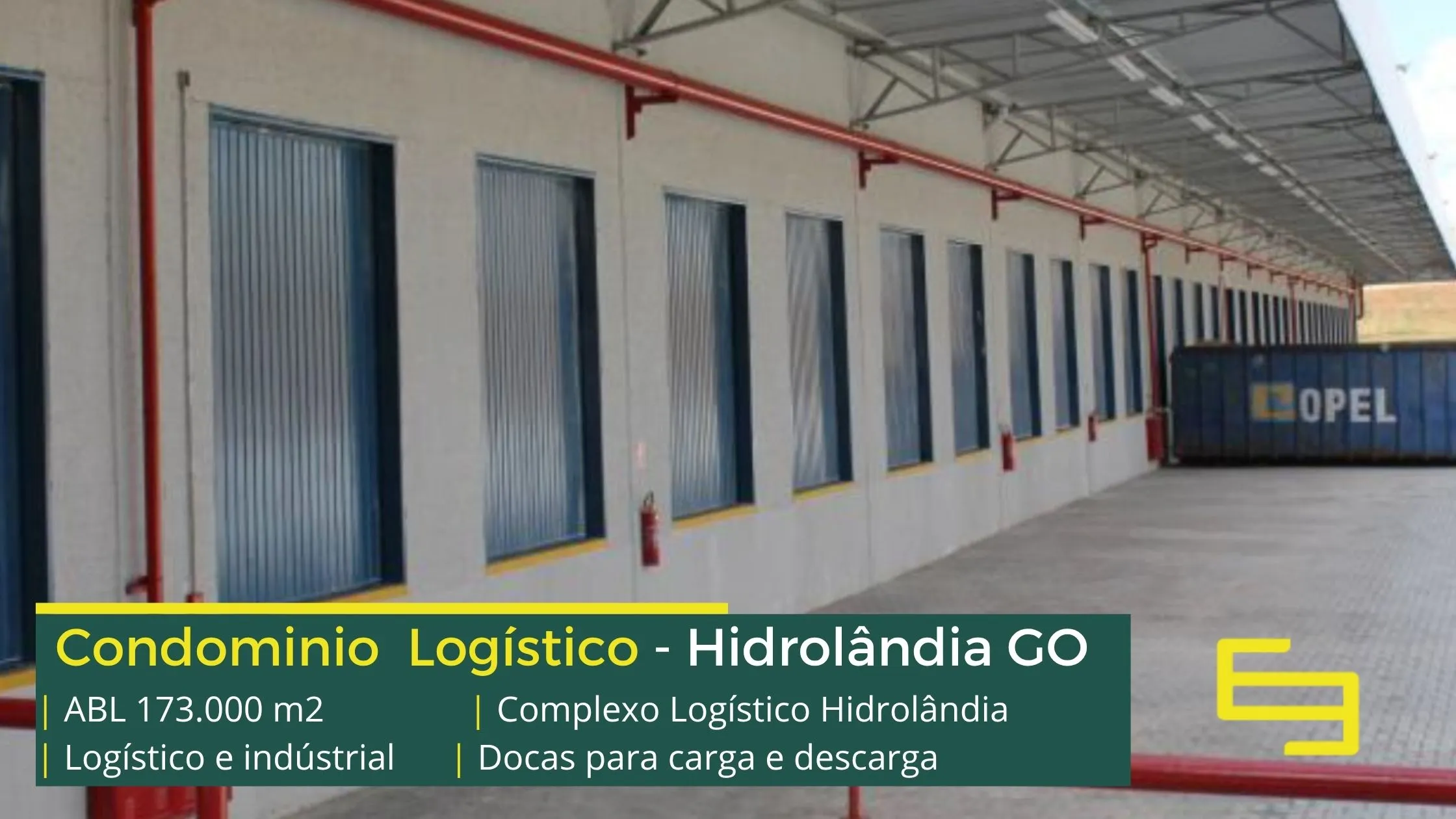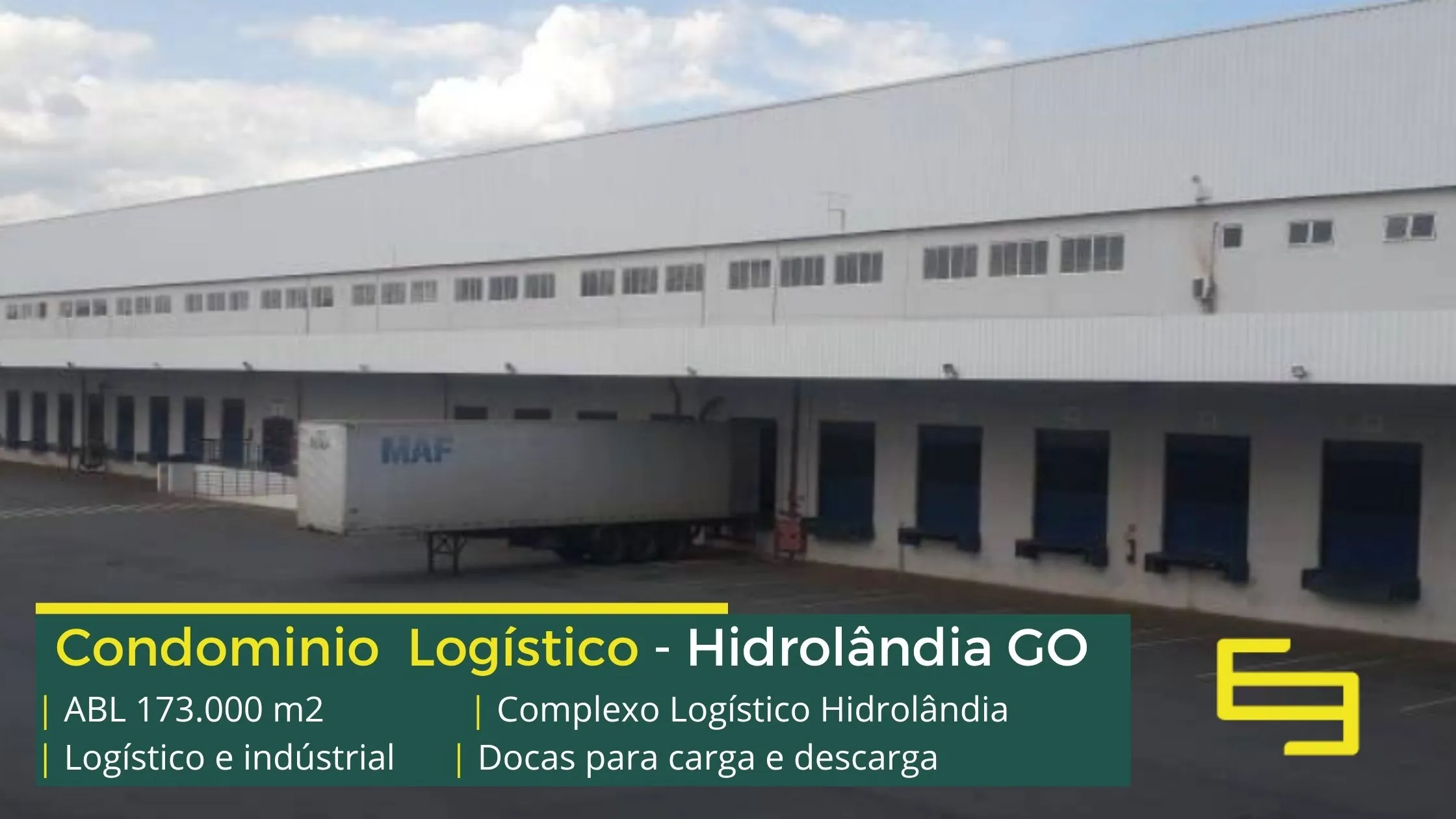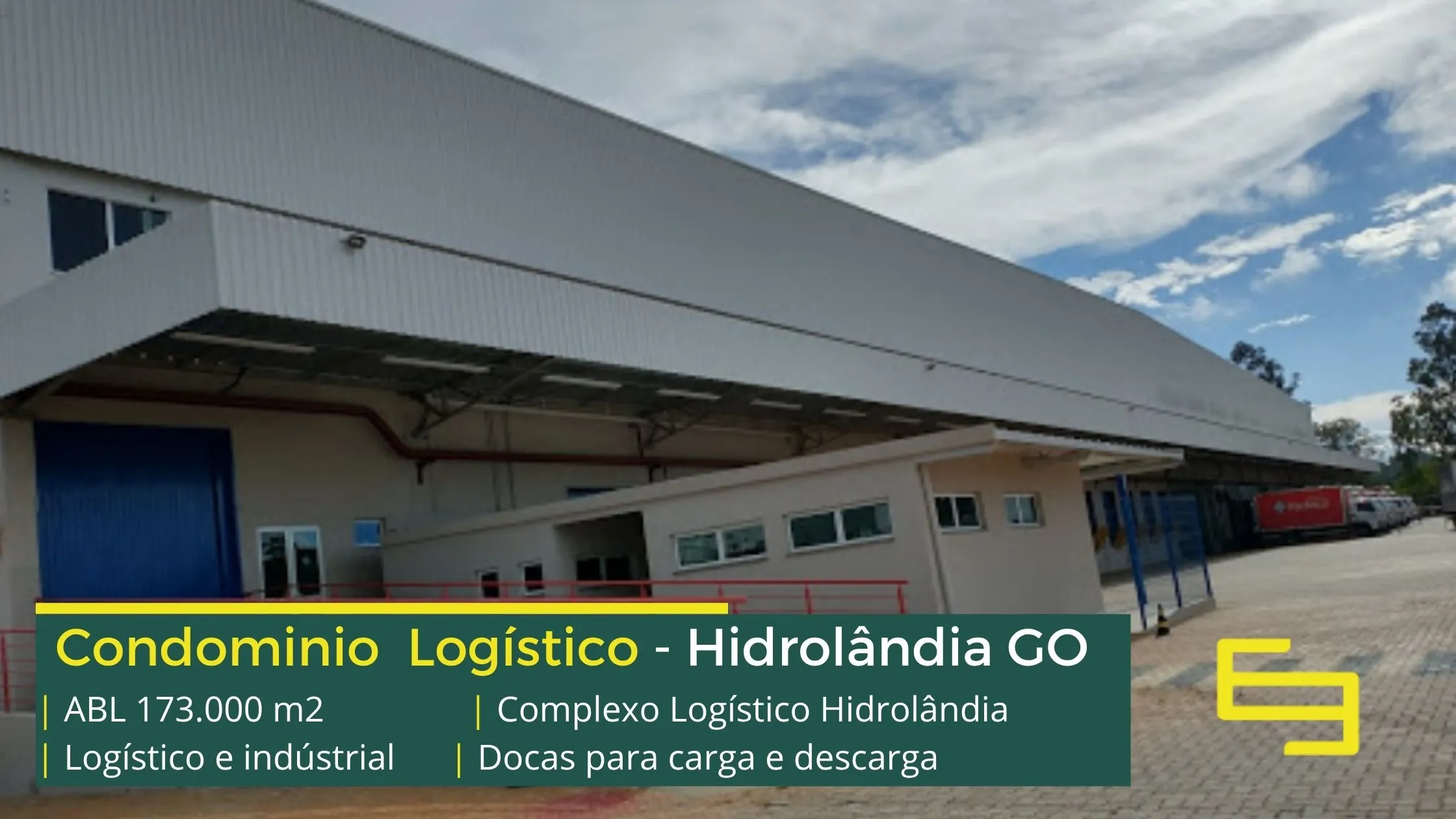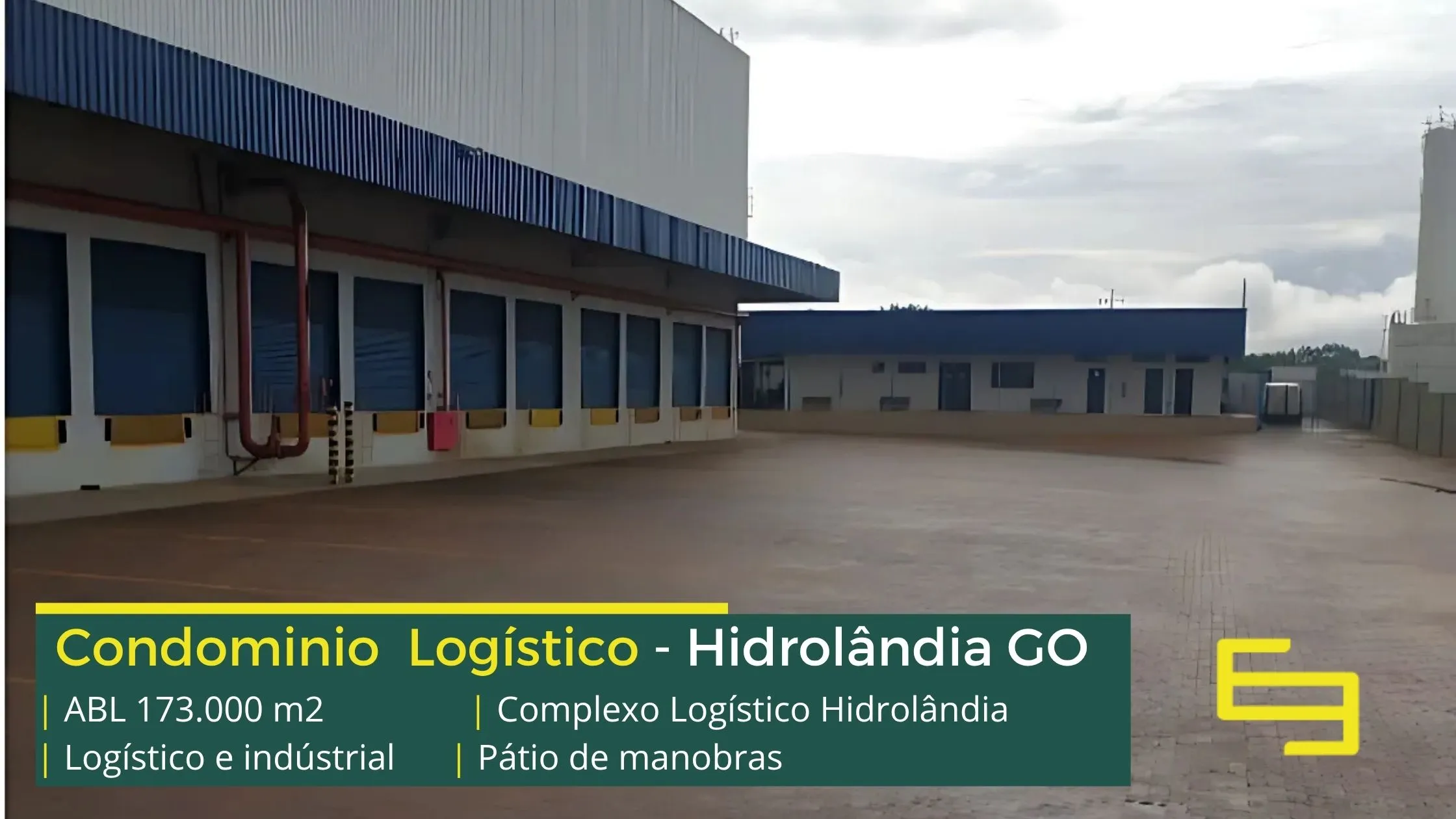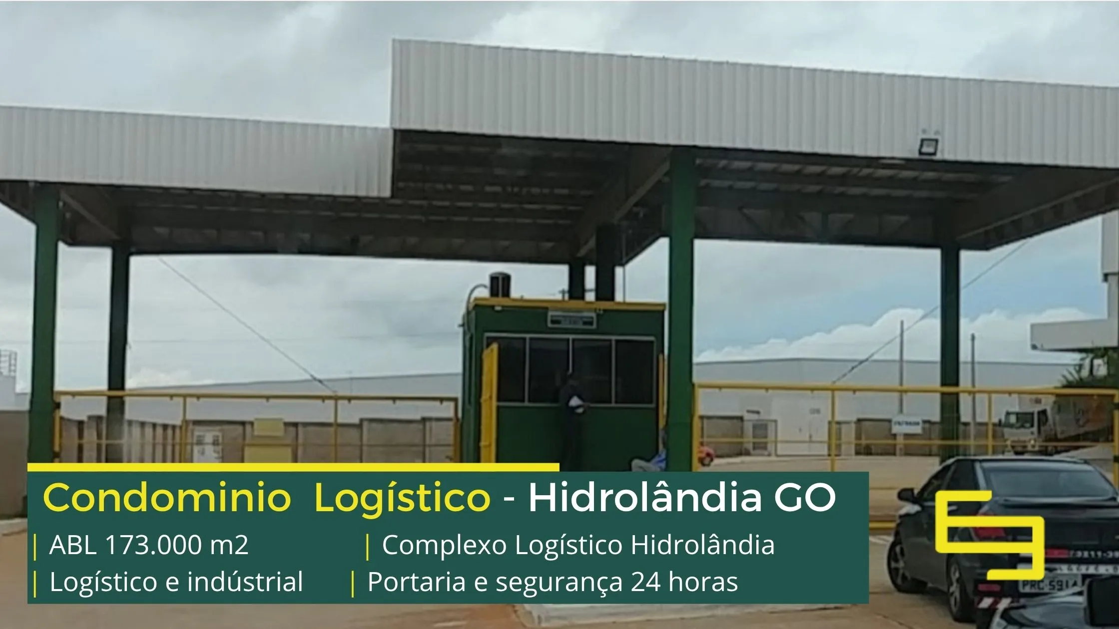 Galpão para alugar na cidade de Hidrolândia em condomínio logístico que conta com portaria com controle de acesso, monitoramento 24 horas, amplo pátio de manobras e além disso, galpões com docas, altura de 12 metros e com área administrativa.