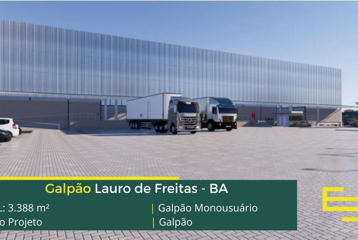 Galpões para alugar em Lauro de Freitas – que é ideal para logística, transportes e além disso, distribuição, possui diferencial em sua localização, a 1,5 km da AV. Santos Dumont, este galpão para locação possuí área construída de 3.388 m².