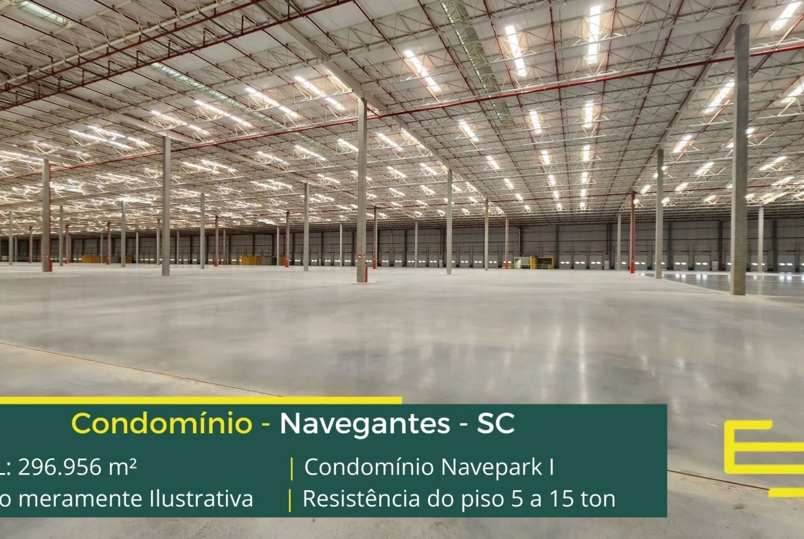 Galpões logísticos e industriais para alugar em Navegantes em condomínio que conta com controle de acesso na portari, e o galpão conta com piso industrial, iluminação LED e sobretudo docas para carga e descarga.