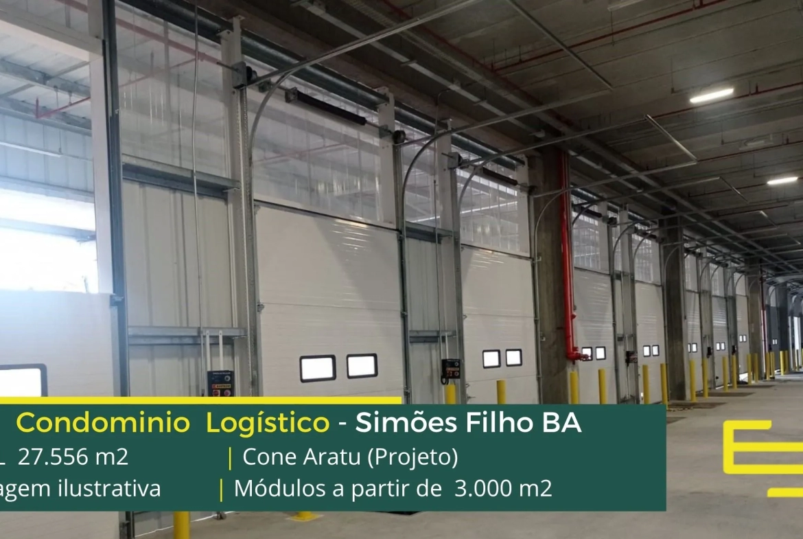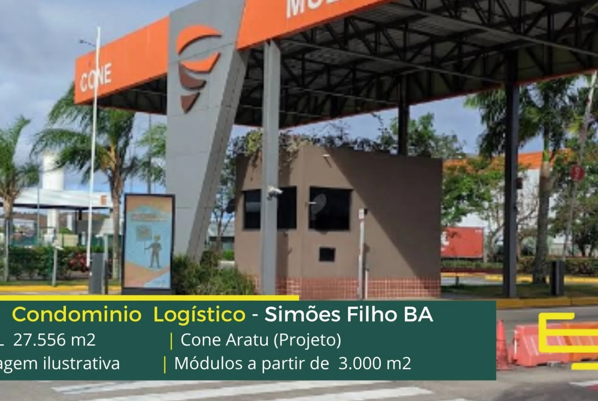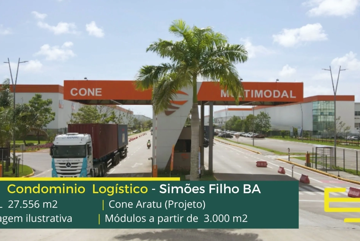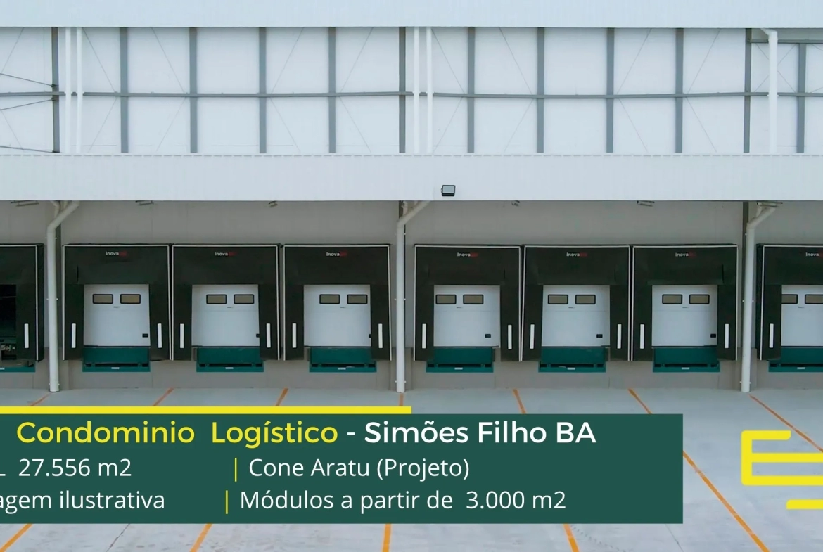 Aluguel de galpão logístico em Simões Filho, em condomínio estrategicamente localizado na região metropolitana de Salvador, com completa estrutura de segurança como portaria 24 horas, área de apoio, controle de acesso informatizado, e que permite locação de galpão em Simões Filho BA com docas para carga e descarga, e com pátio de manobras.